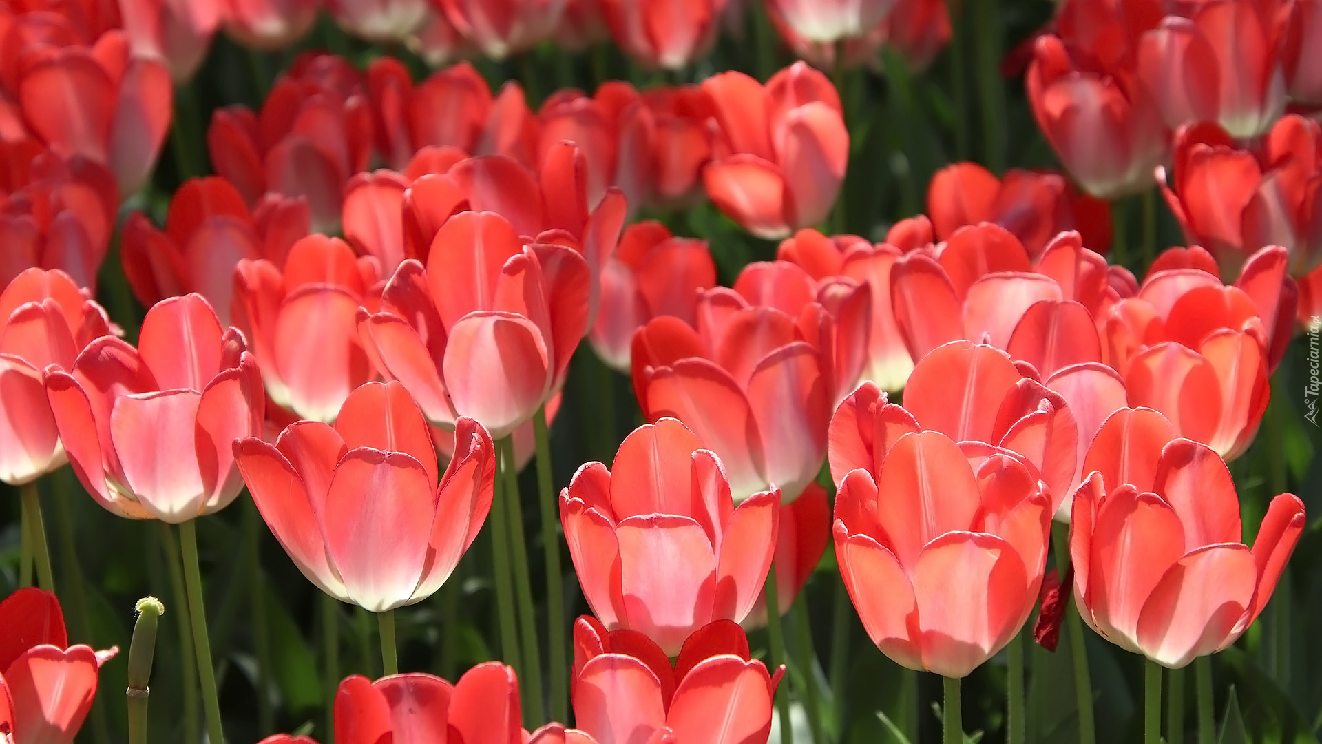 Edytor tapety: Rozkwitnięte i rozświetlone czerwone tulipany