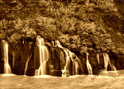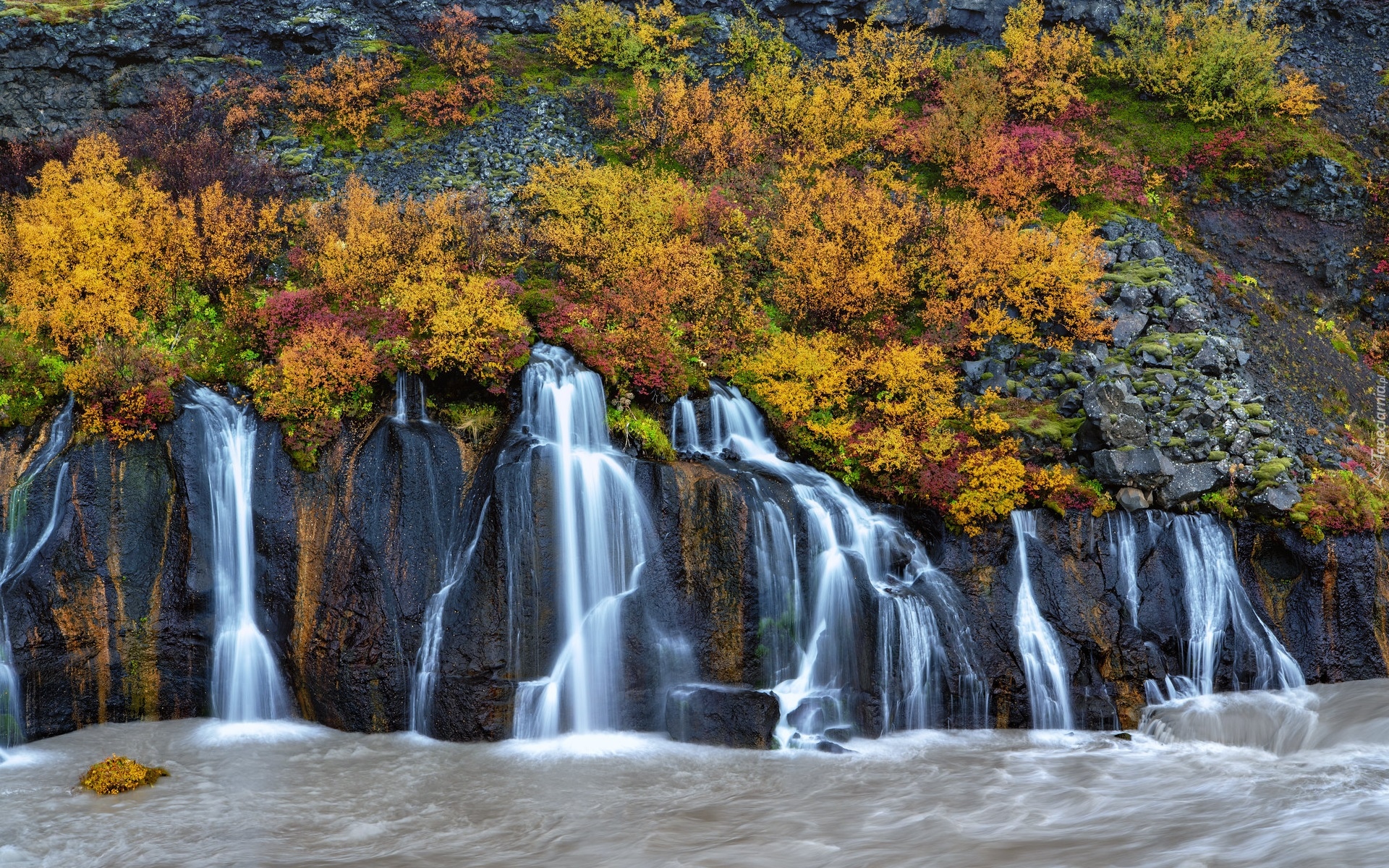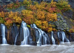 Edytor tapety: Pożółkła roślinność na skałach przy wodospadzie Hraunfossar