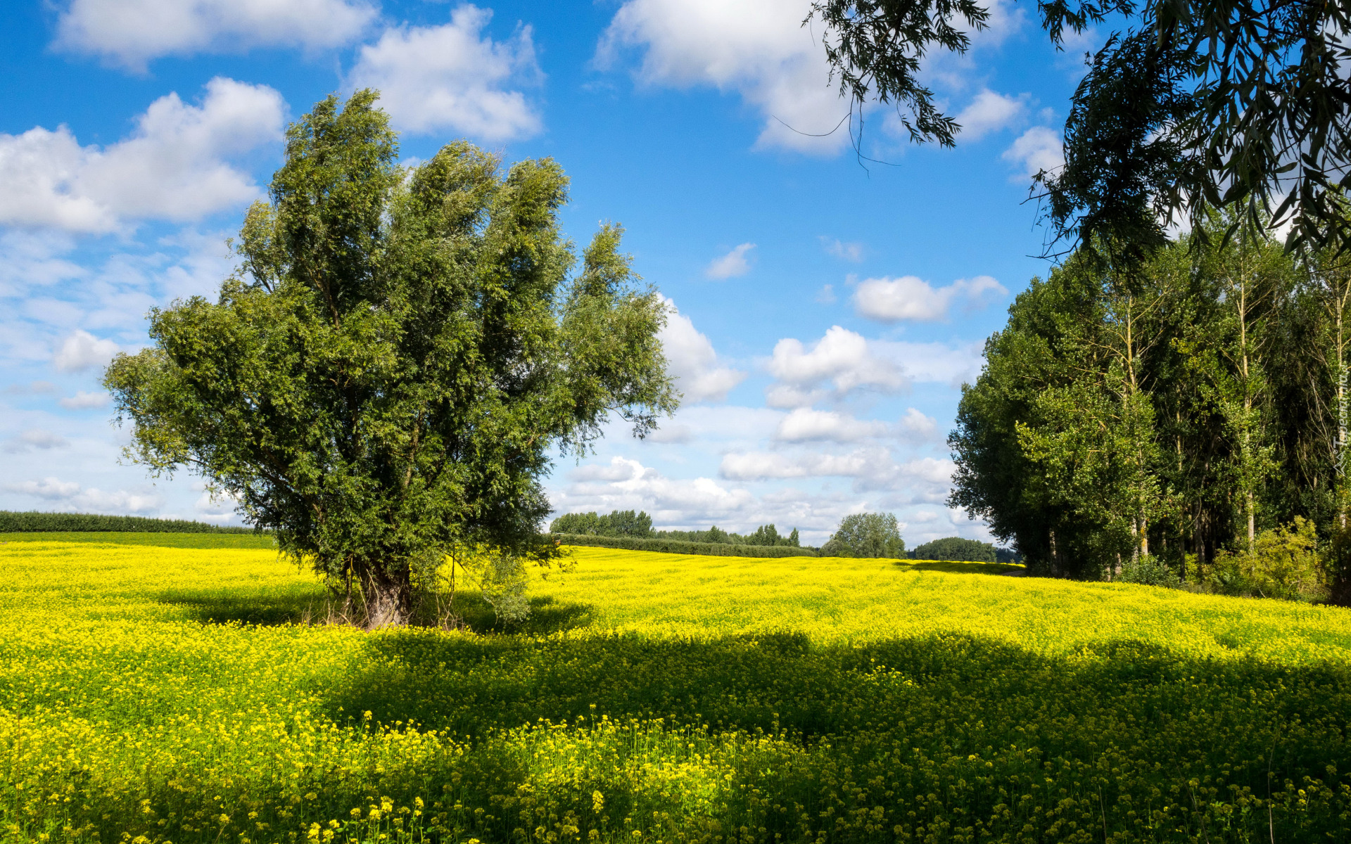 Edytor tapety: Drzewa na polu kwitnącego rzepaku