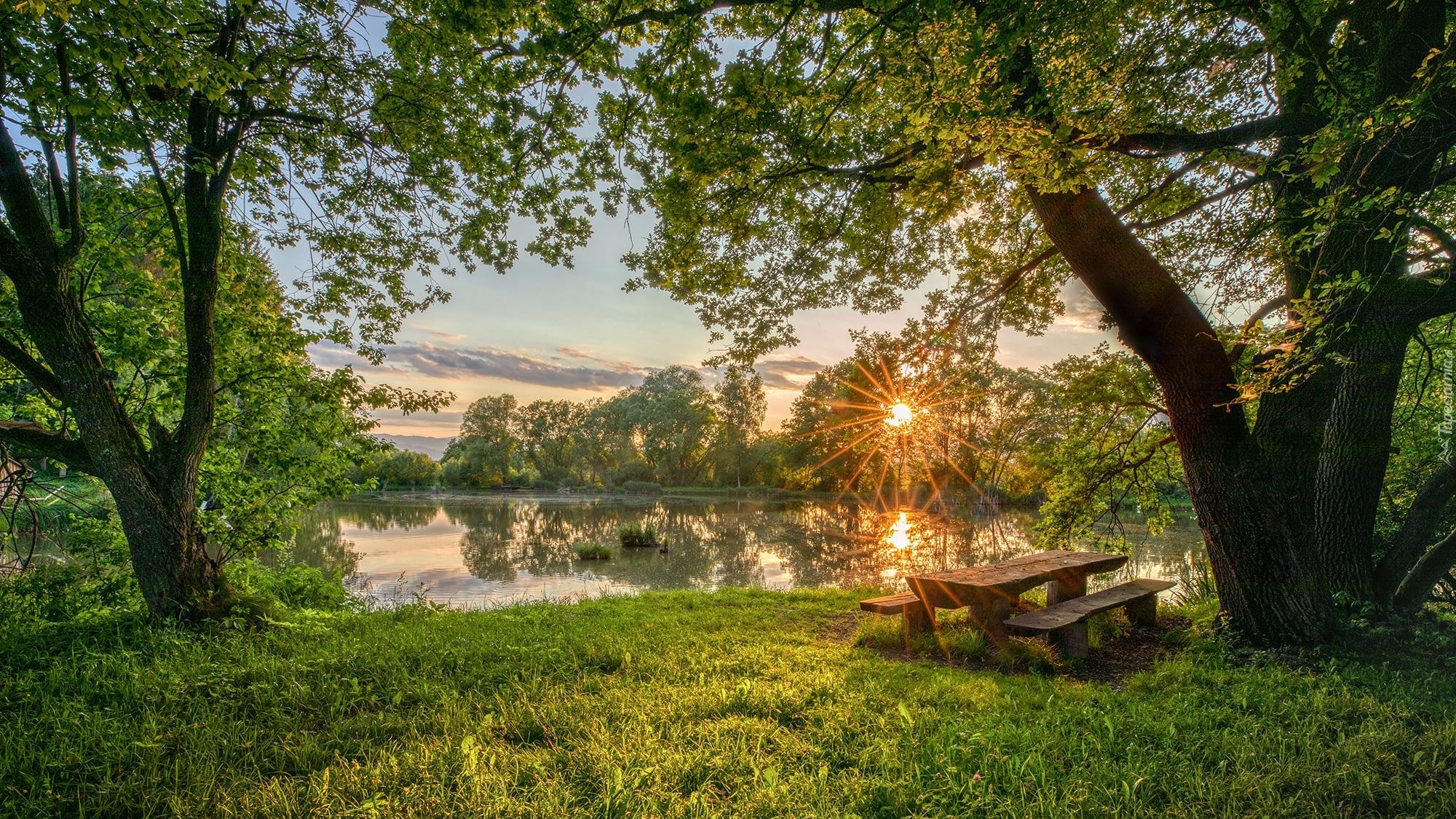 Edytor tapety: Ławka pod drzewem w promieniach słońca