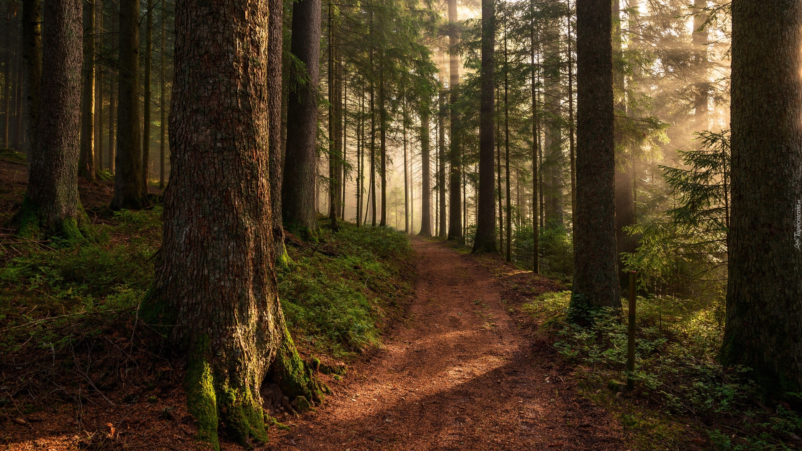 Edytor tapety: Rozświetlone drzewa i ścieżka w lesie