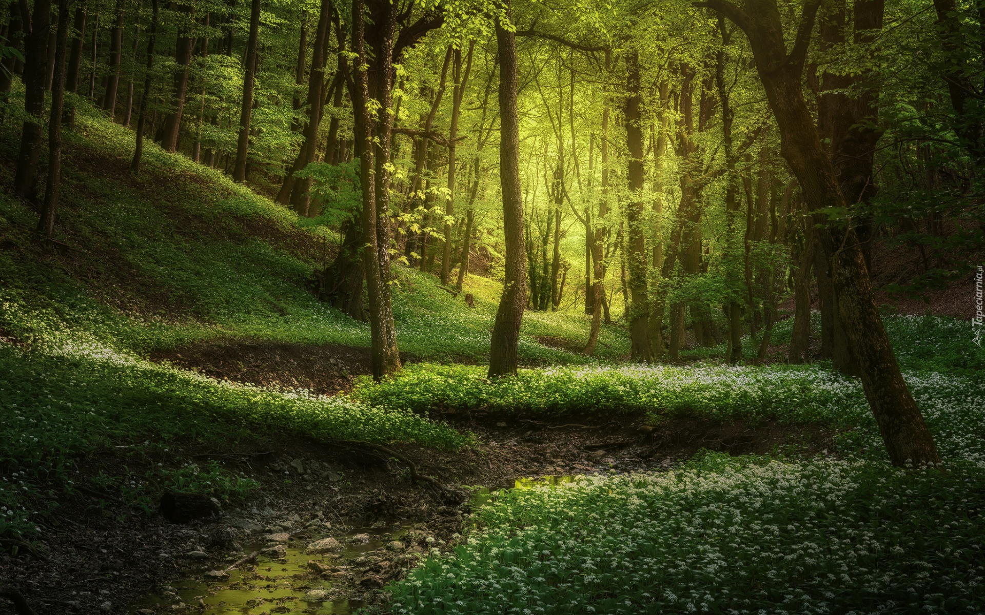 Edytor tapety: Czosnek niedźwiedzi pod drzewami w słonecznym lesie
