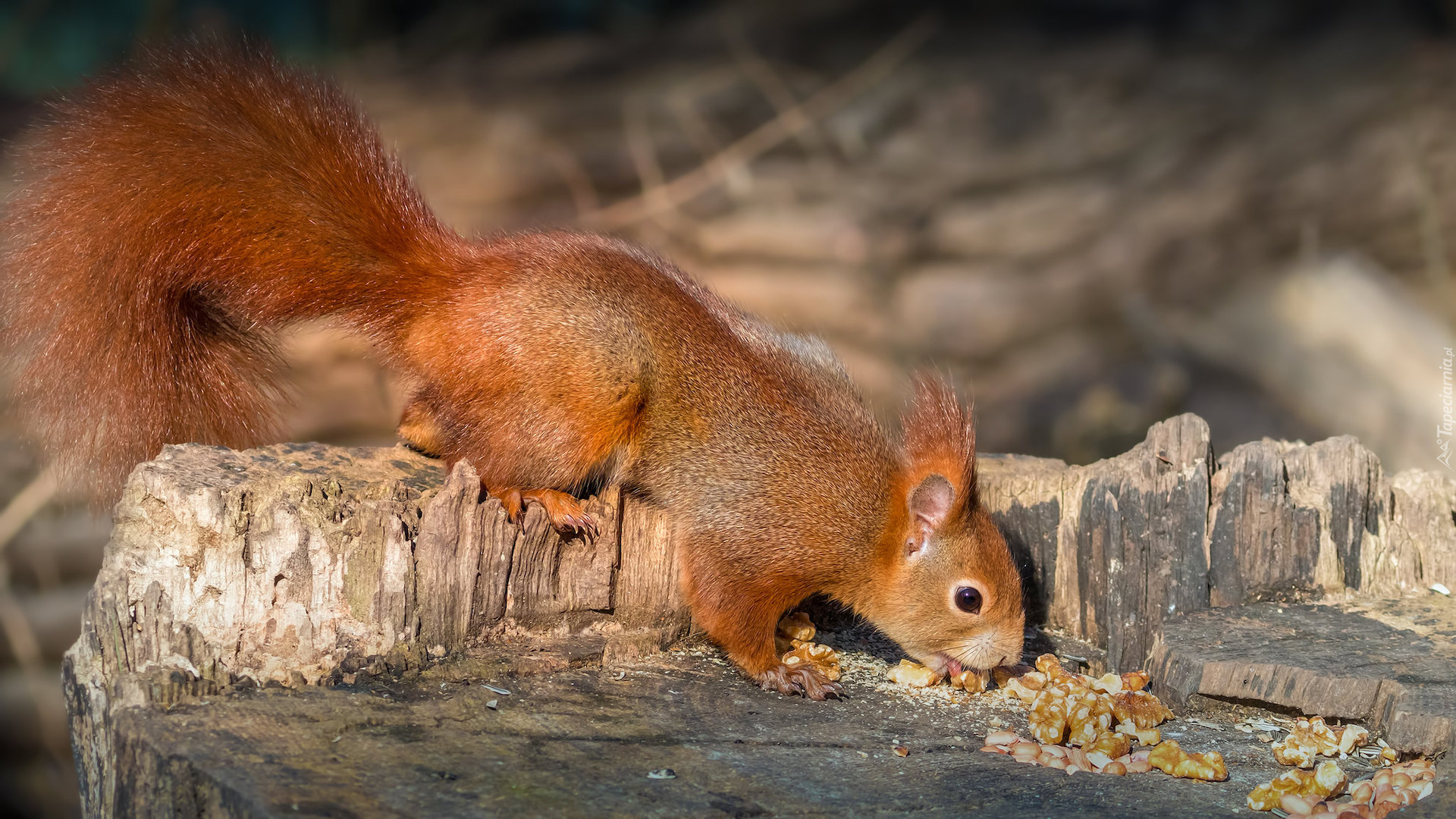 Edytor tapety: Ruda wiewiórka na pniu drzewa