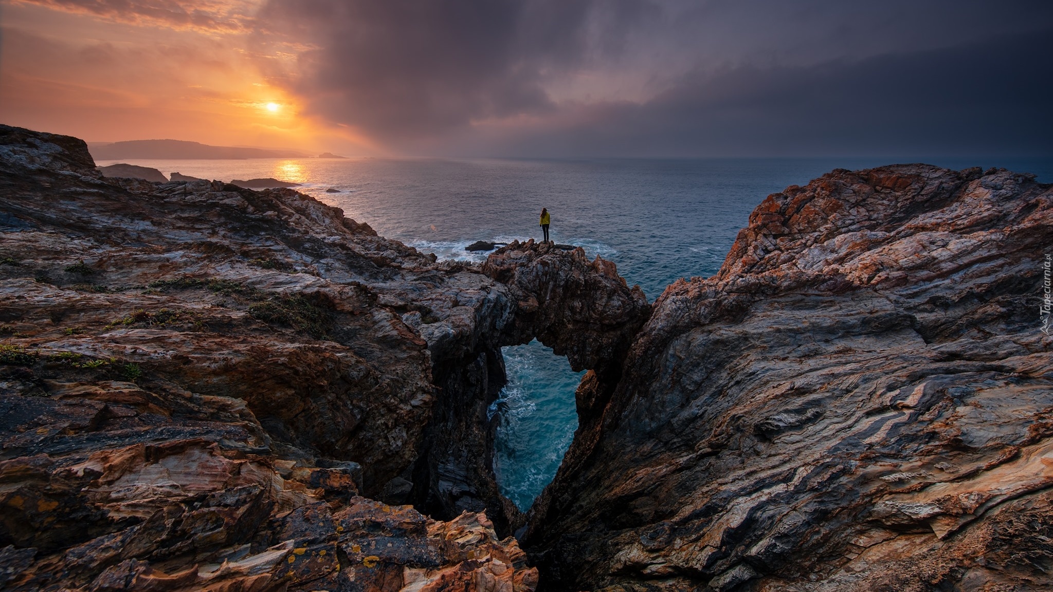 Edytor tapety: Kobieta na skalnym łuku nad morzem