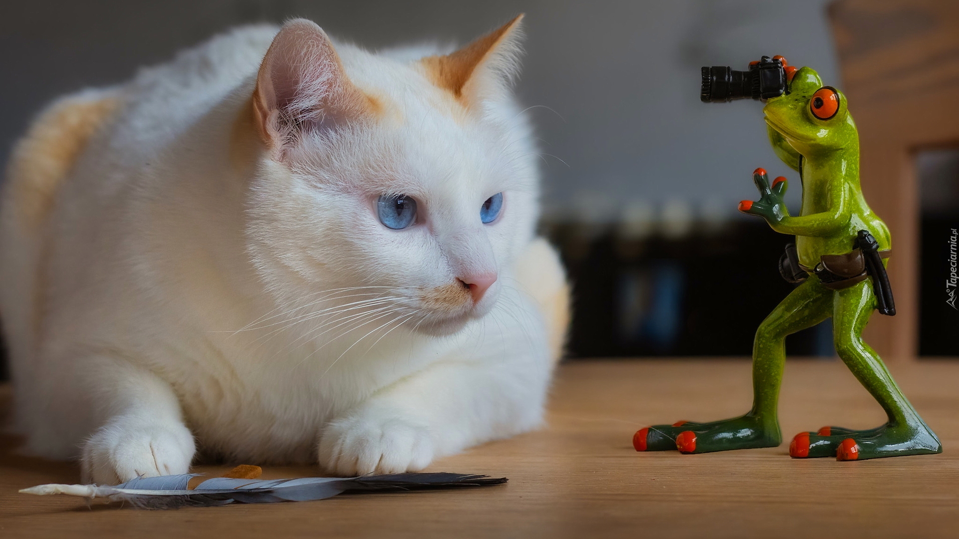 Edytor tapety: Figurka żaby z aparatem obok kota