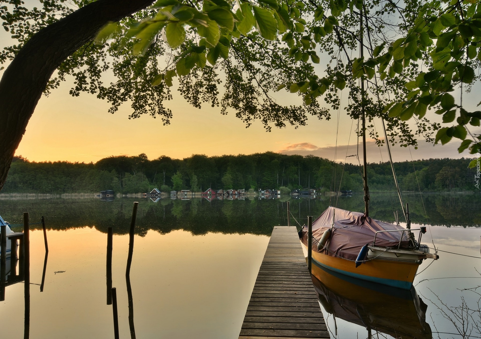Edytor tapety: Drewniany pomost i żaglówka na jeziorze