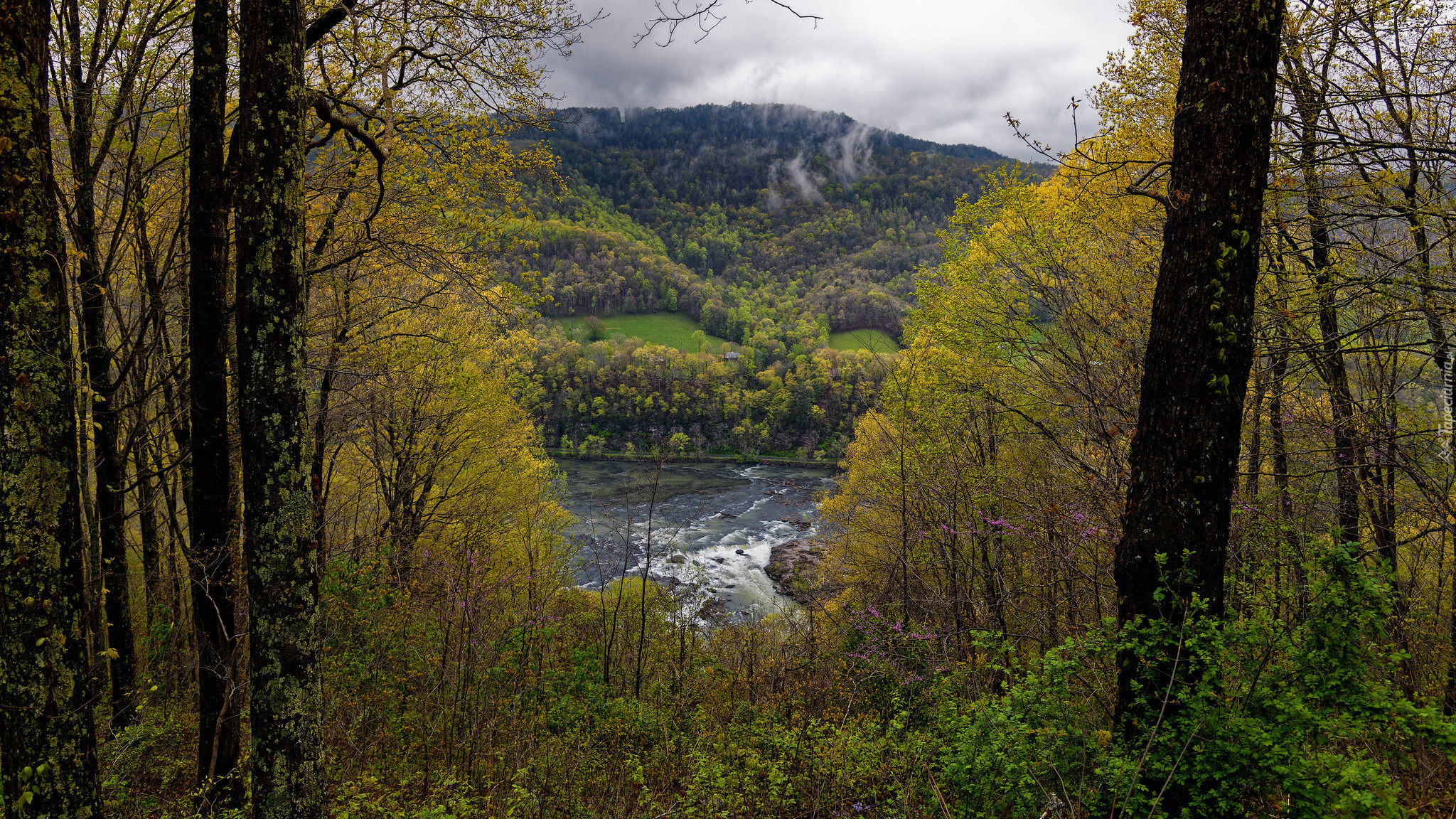 Edytor tapety: Drzewa na wzgórzach nad rzeką