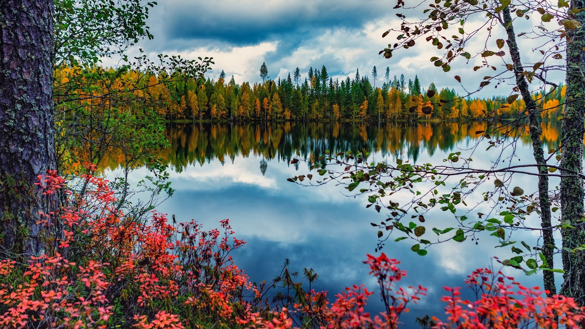 Edytor tapety: Kolorowe jesienne krzewy i drzewa nad jeziorem