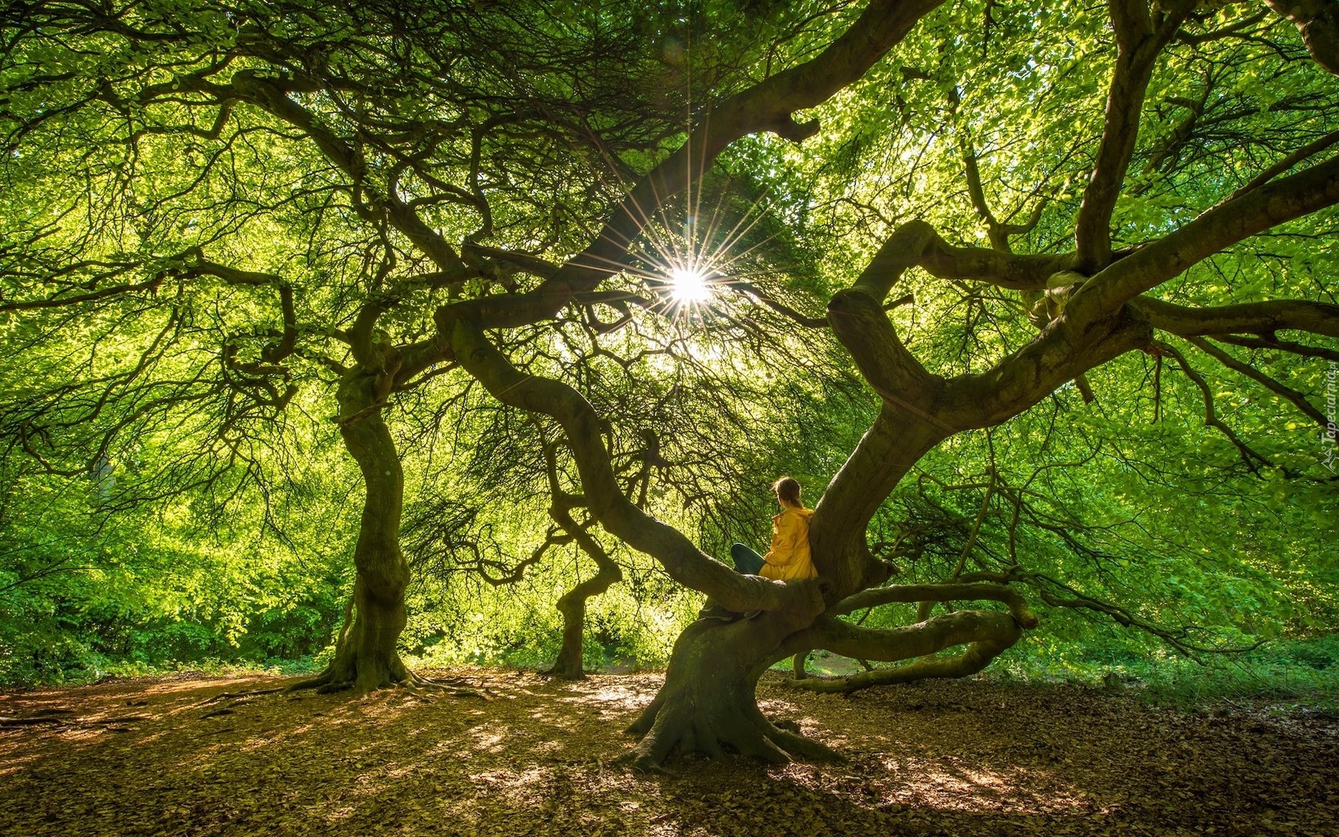 Edytor tapety: Kobieta siedząca na rozświetlonym rozłożystym drzewie