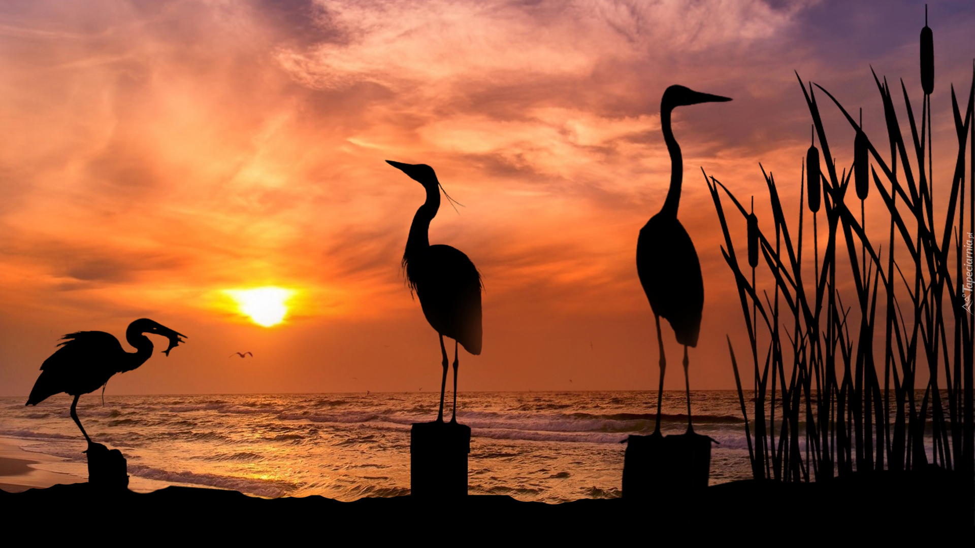 Edytor tapety: Czaple na palach nad morzem