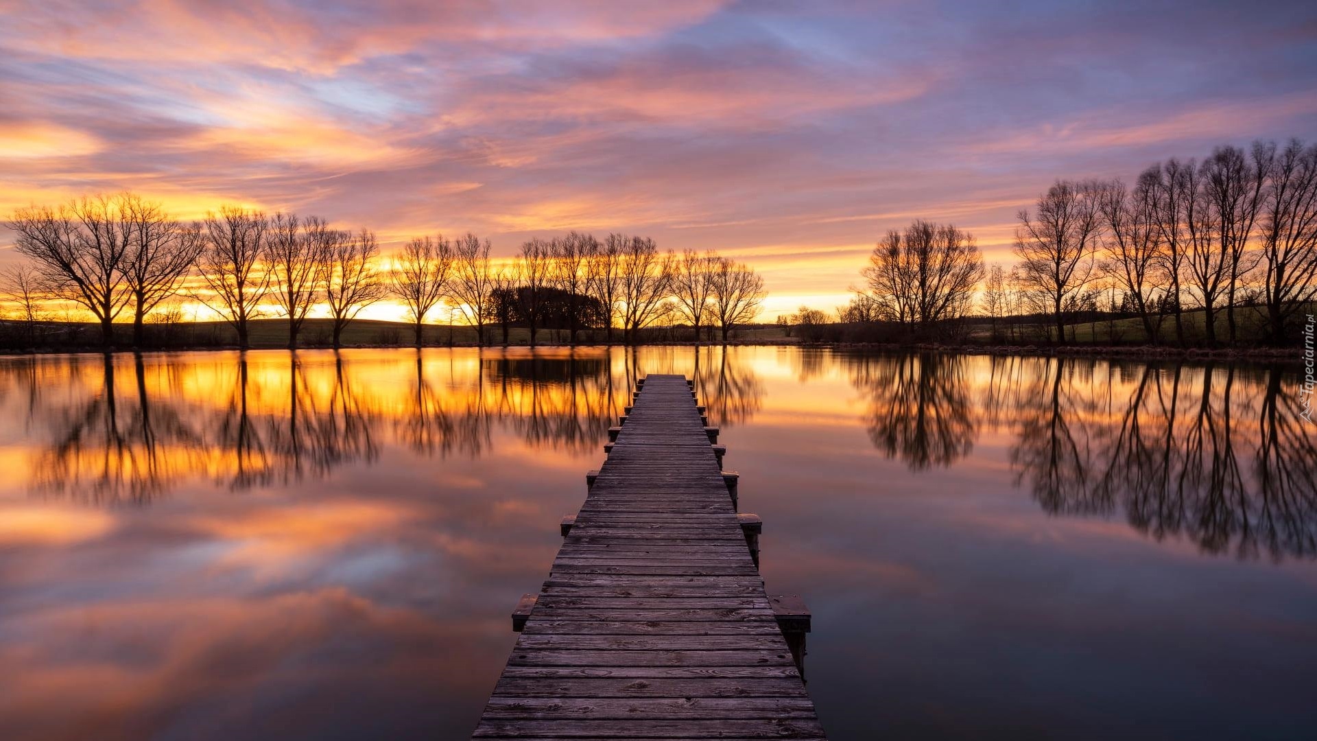 Edytor tapety: Pomost i drzewa nad jeziorem o zmierzchu