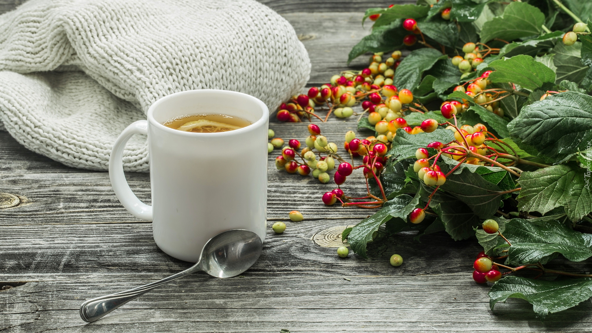 Edytor tapety: Kubek herbaty obok swetra i jagód