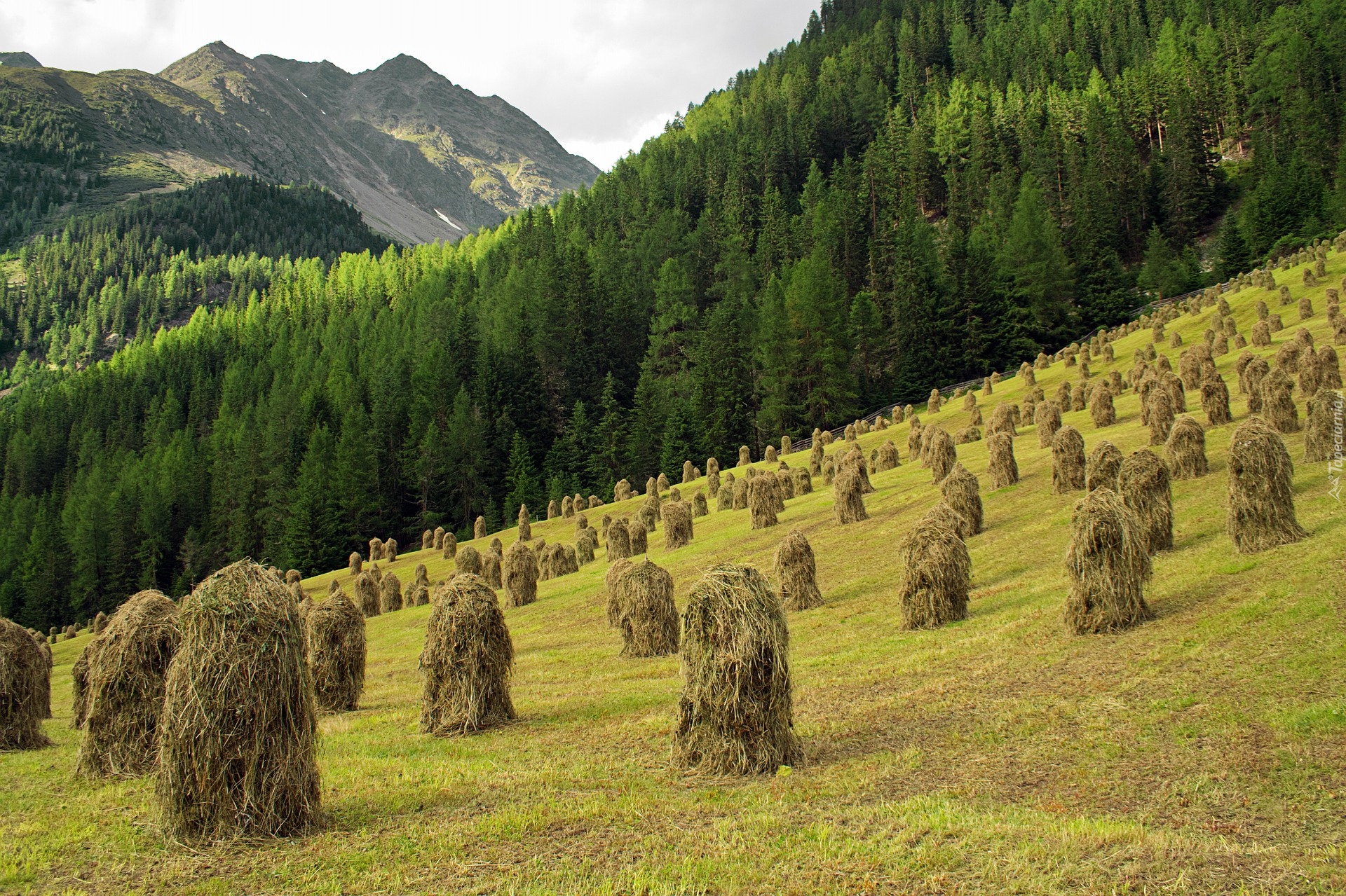 Edytor tapety: Stogi siana na górskiej łące