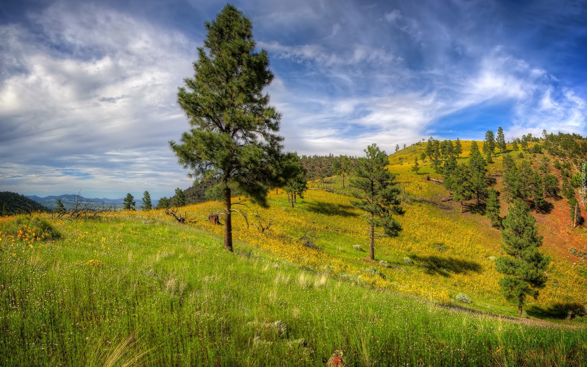 Edytor tapety: Drzewa na zielonych wzgórzach w słonecznym blasku