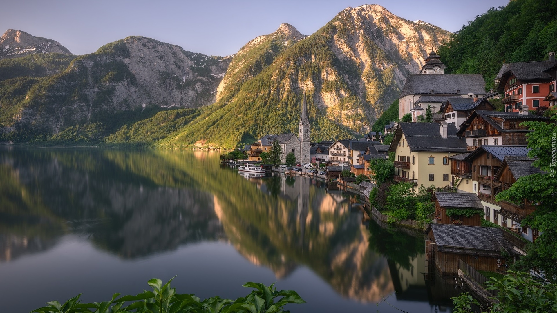 Edytor tapety: Miasteczko Hallstatt na tle rozświetlonych Alp Salzburskich