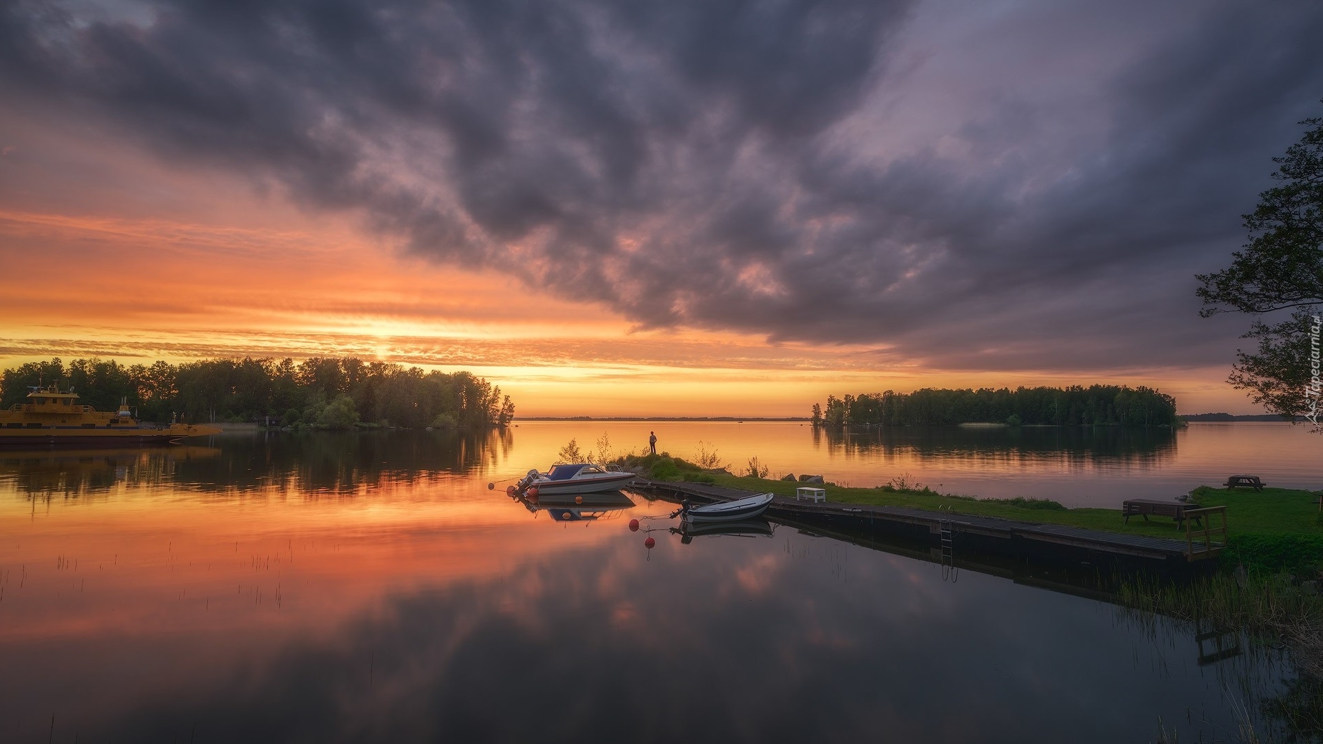 Edytor tapety: Łódki przy pomoście na jeziorze o zachodzie słońca
