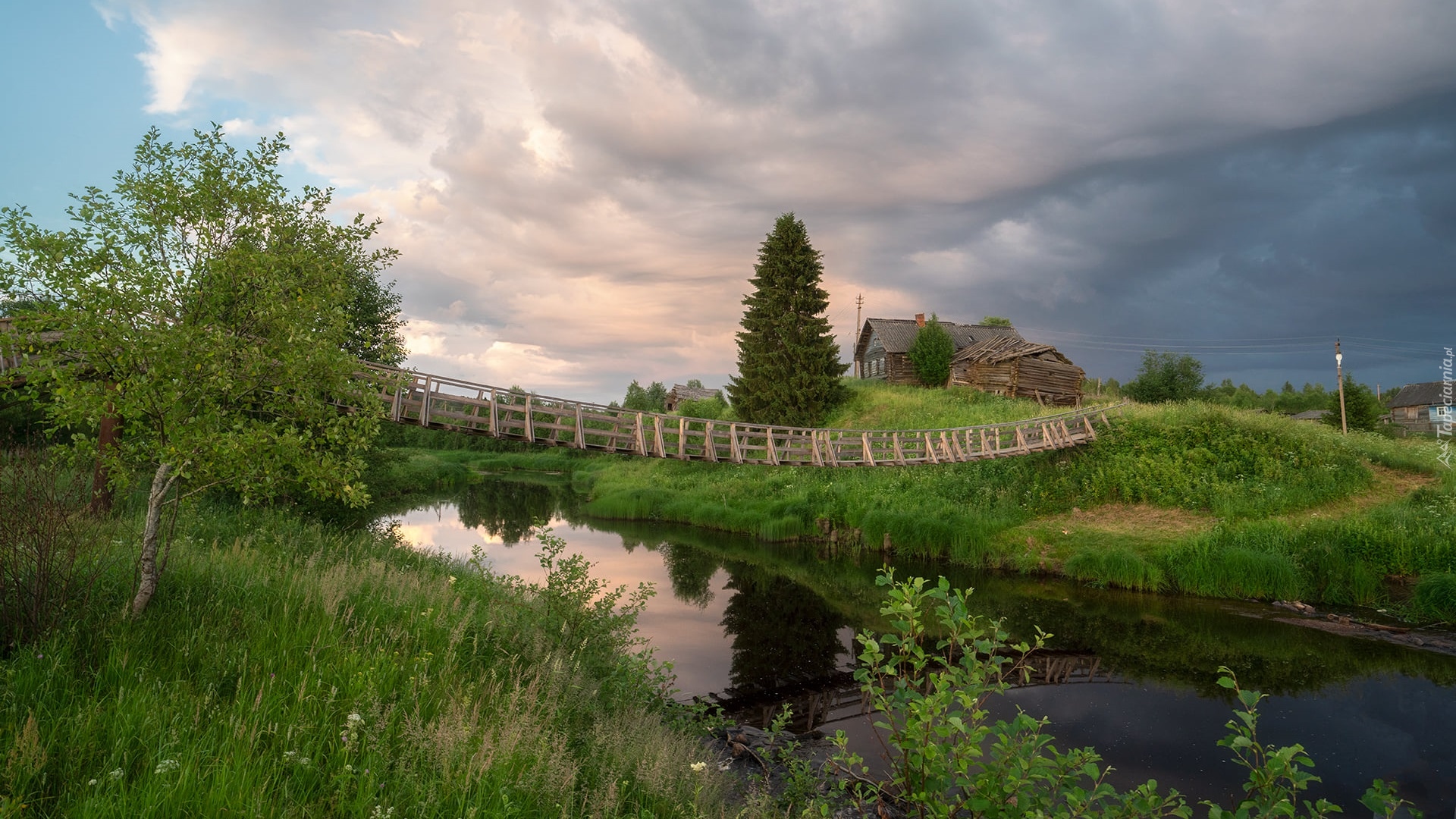 Edytor tapety: Wiszący drewniany most nad rzeką