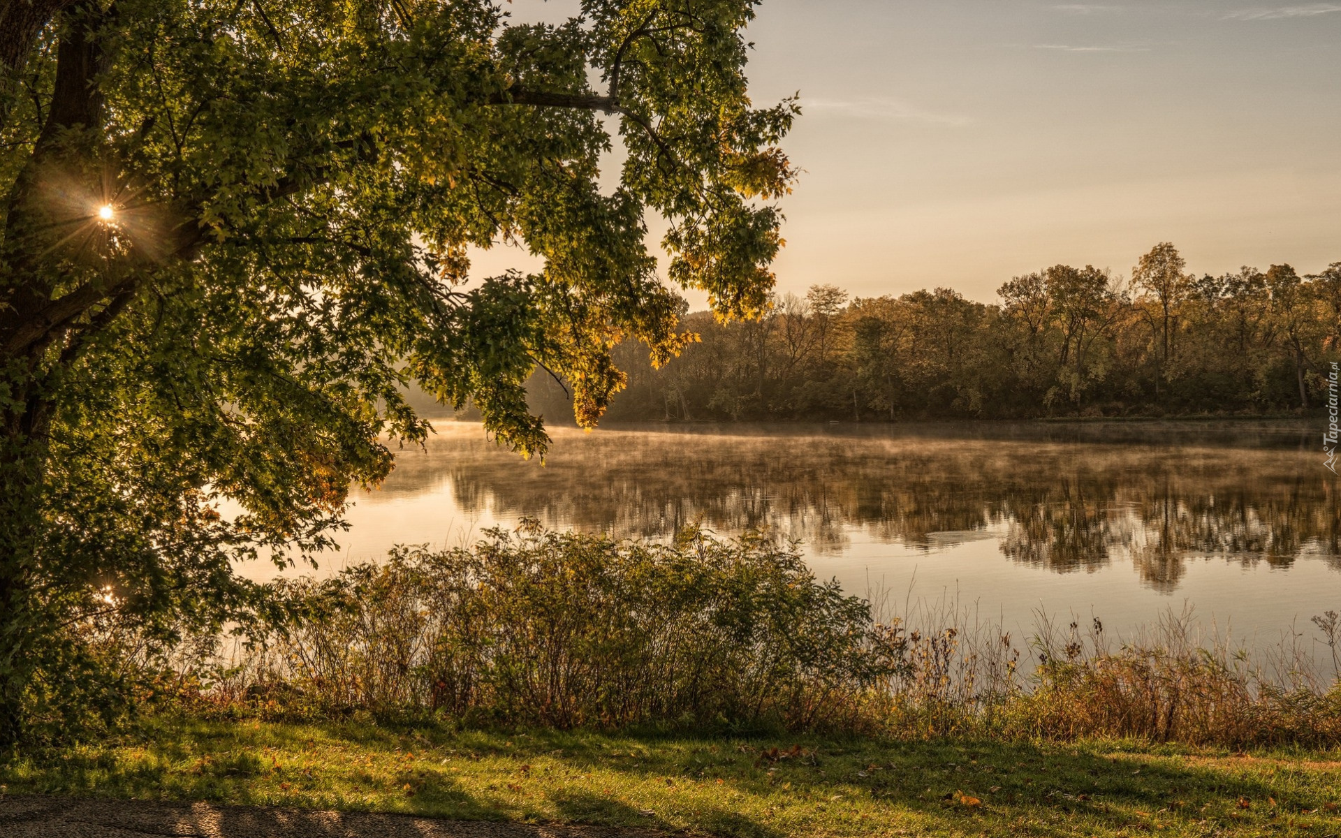 Edytor tapety: Drzewo i trawy nad jeziorem