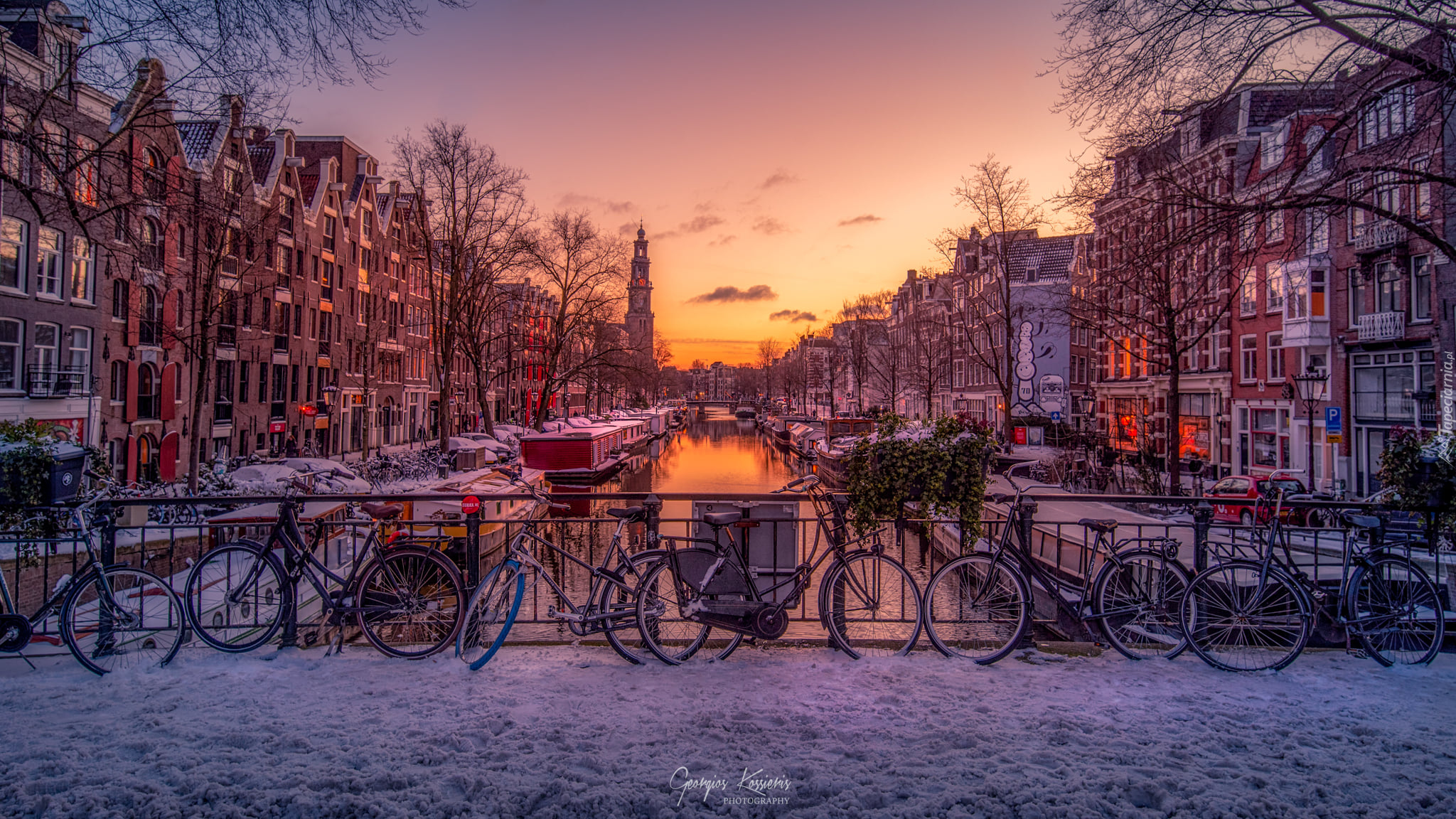 Edytor tapety: Rowery na ośnieżonym moście nad kanałem w Amsterdamie