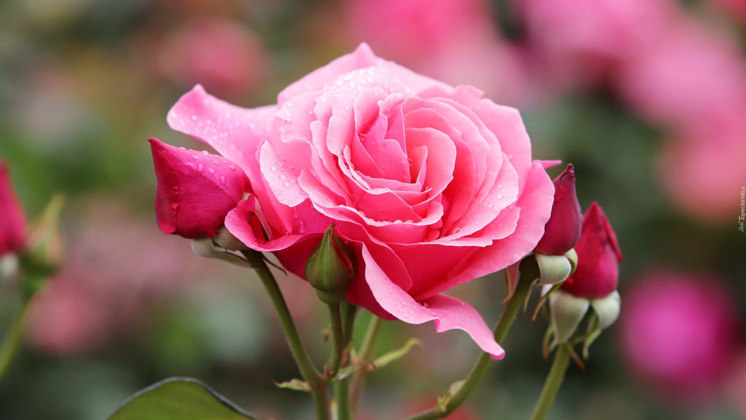 Edytor tapety: Krople wody na różowej róży z pąkami