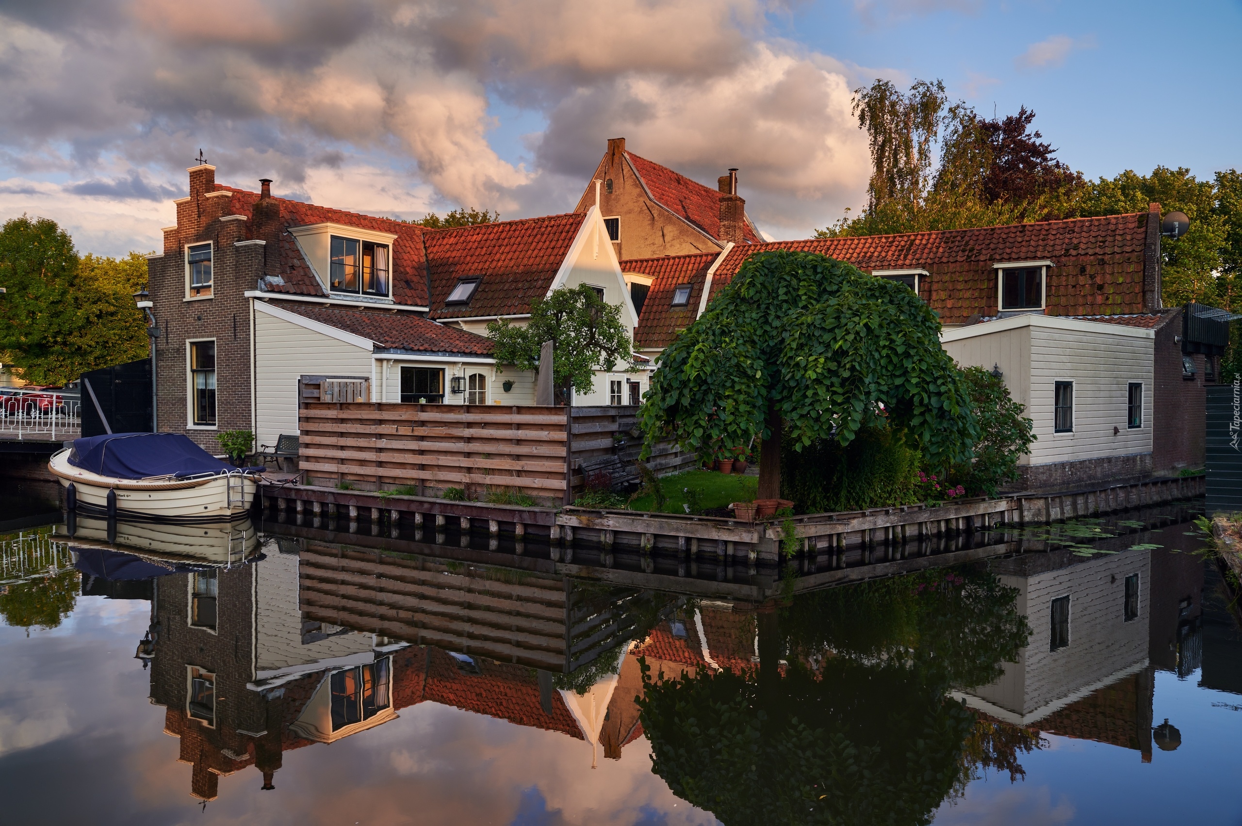 Edytor tapety: Łódka przy domu nad kanałem w Holandii