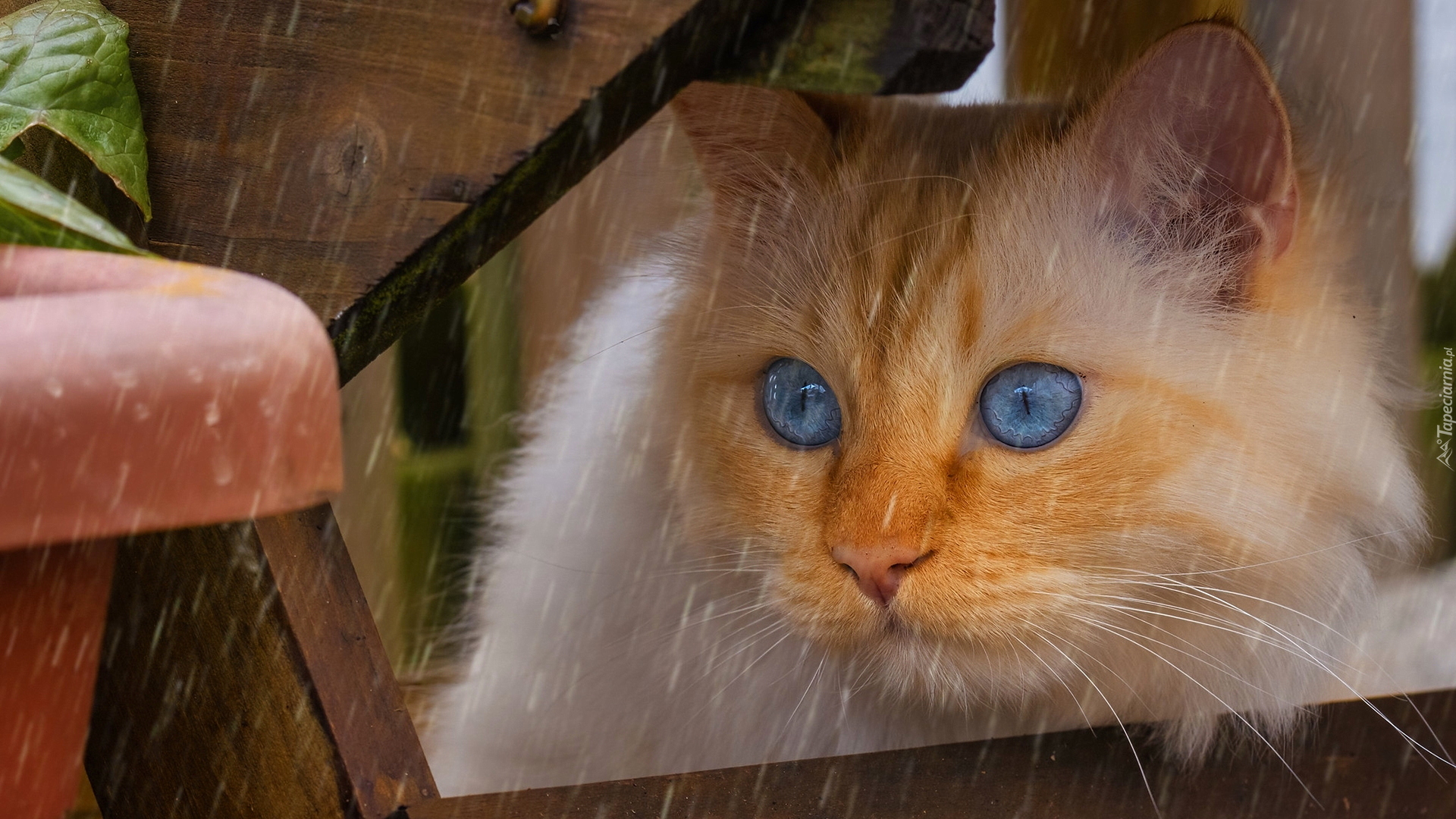 Edytor tapety: Rudy kot schowany pod ławką przed deszczem