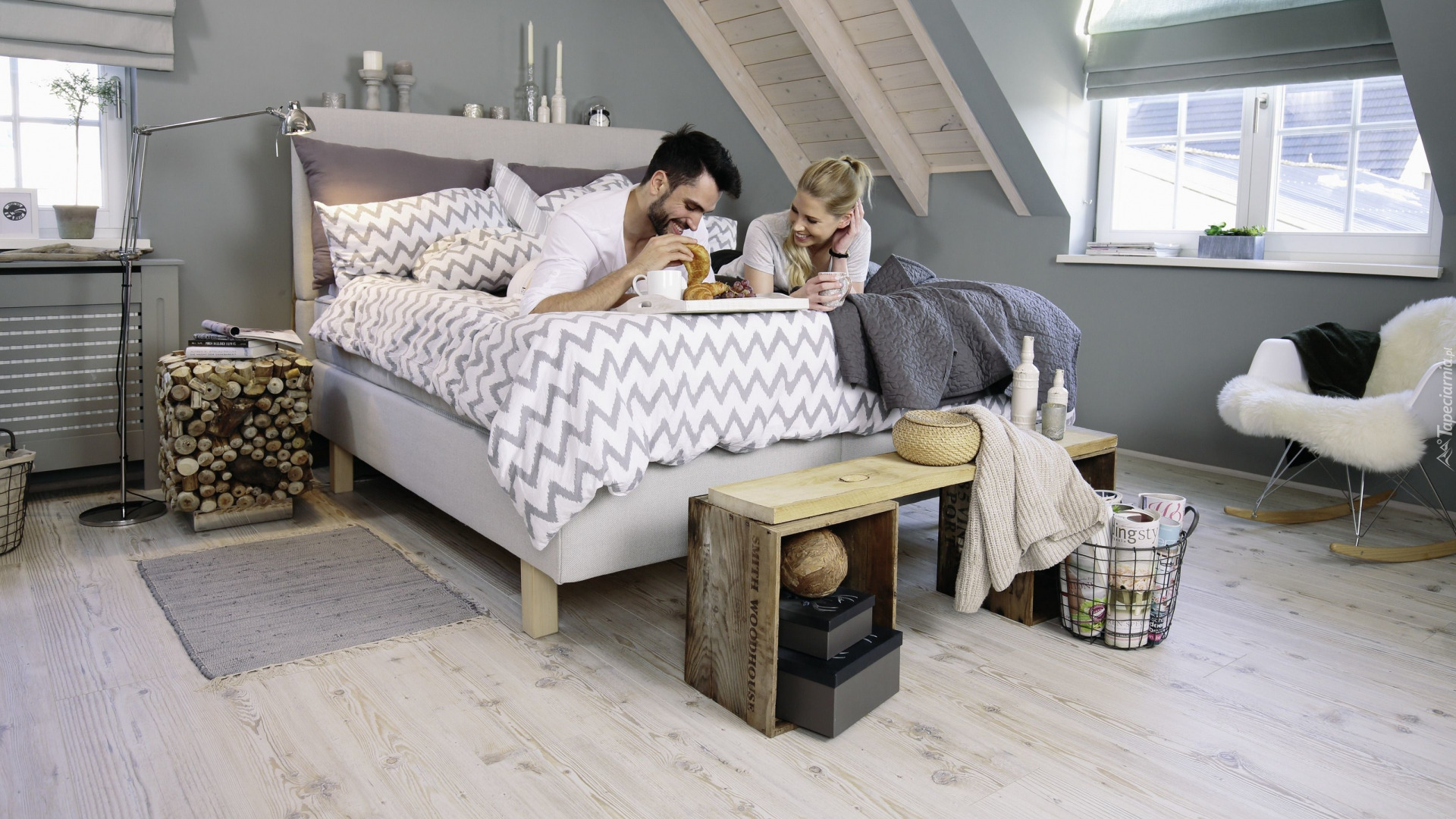 Edytor tapety: Para na łóżku na poddaszu jedząca śniadanie