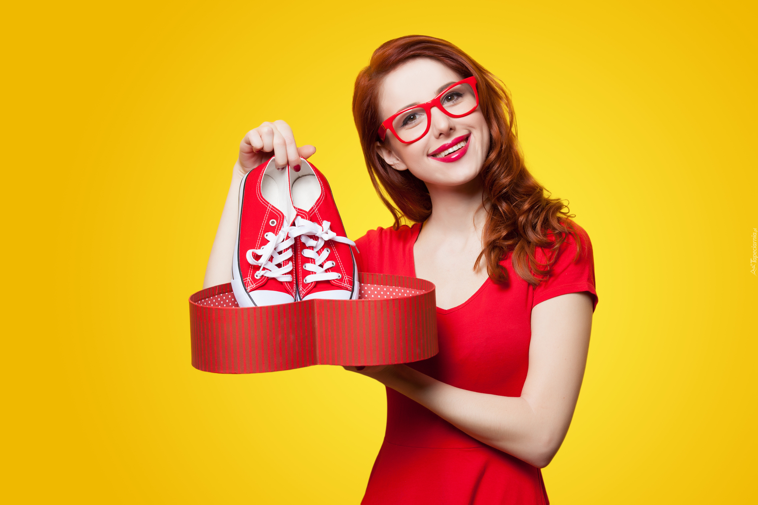 Edytor tapety: Kobieta w czerwonej sukience z trampkami w pudełku