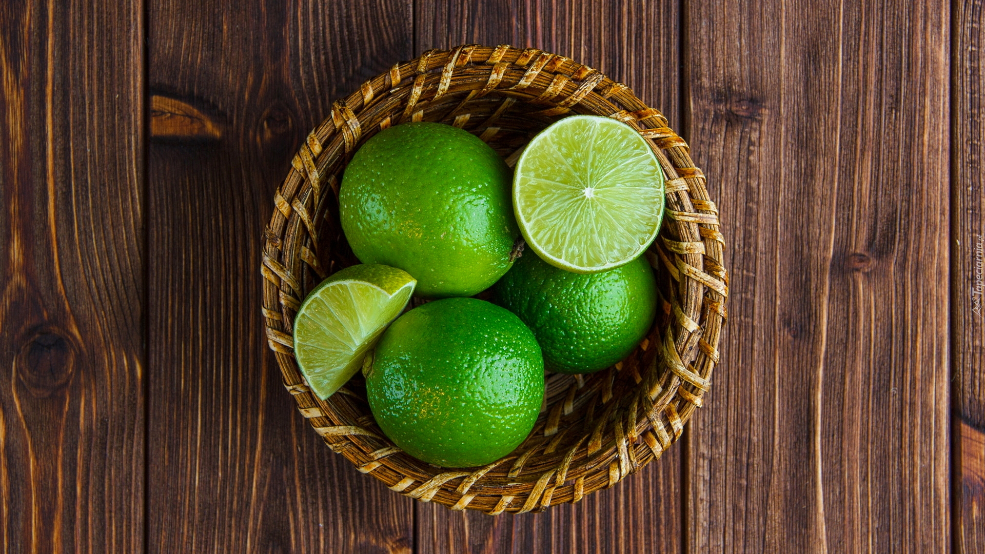 Edytor tapety: Limonki w koszyku na drewnianych deskach