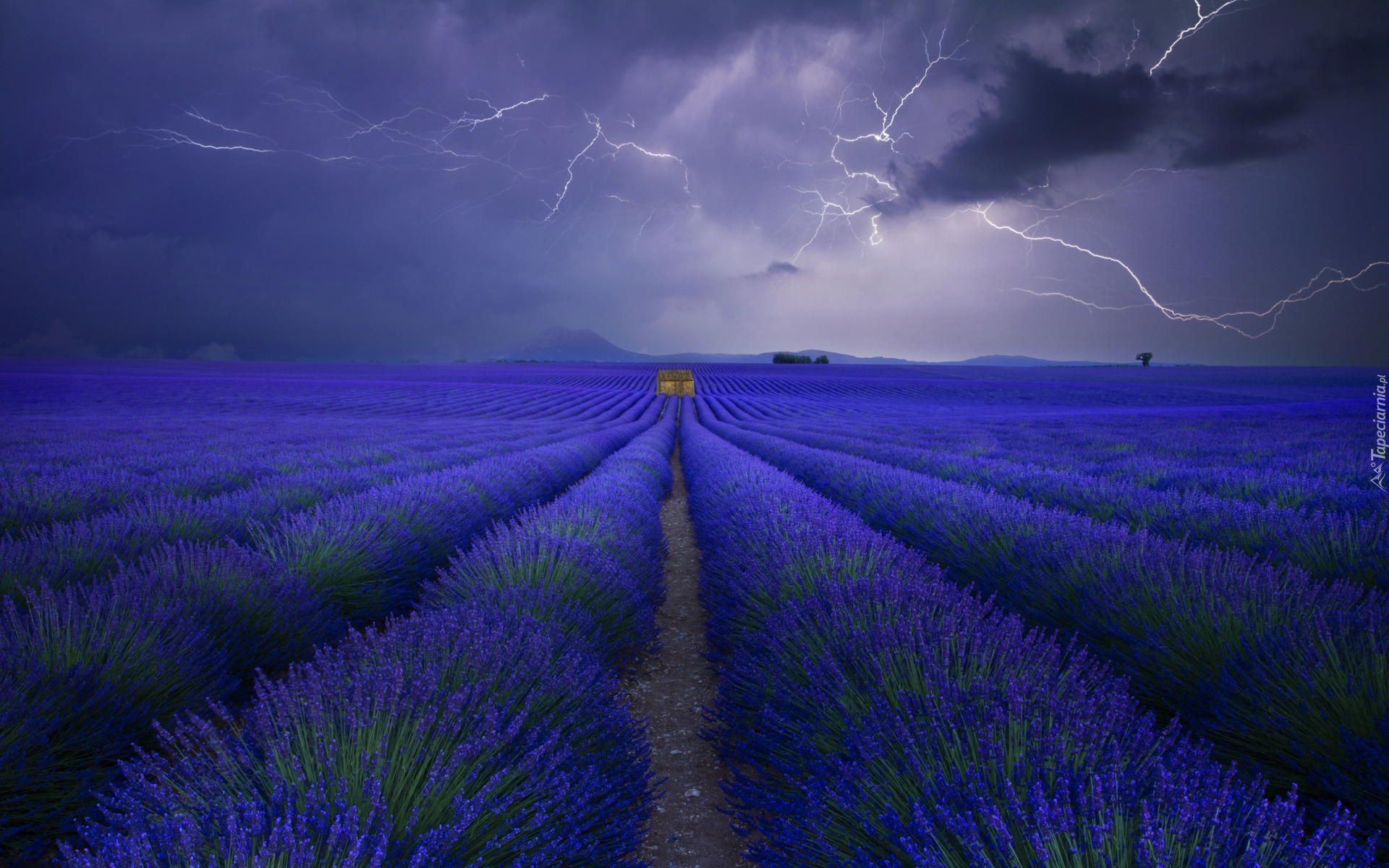 Edytor tapety: Zachmurzone niebo i błyskawica nad polem lawendy