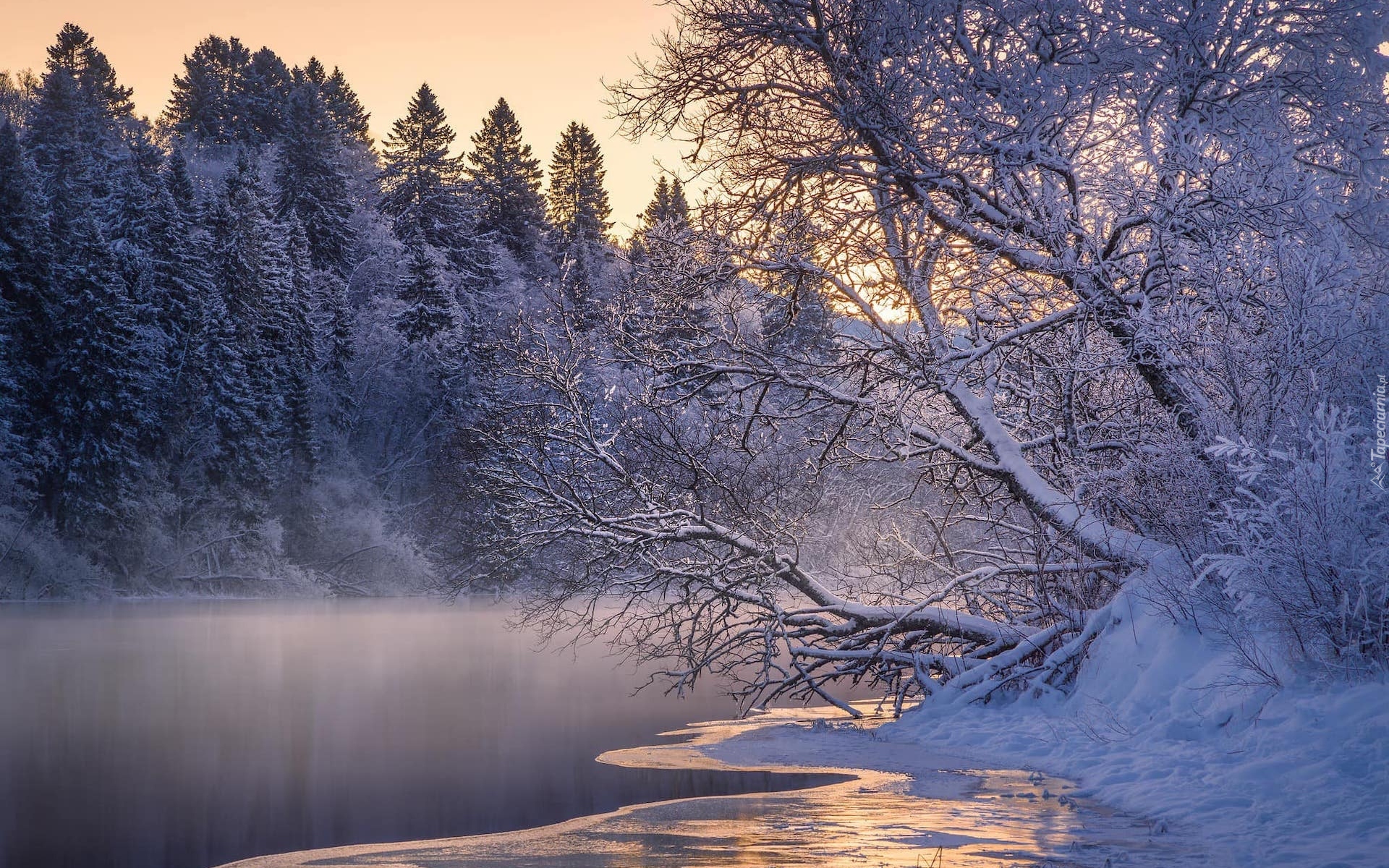 Edytor tapety: Ośnieżone drzewa na brzegach zamglonej rzeki