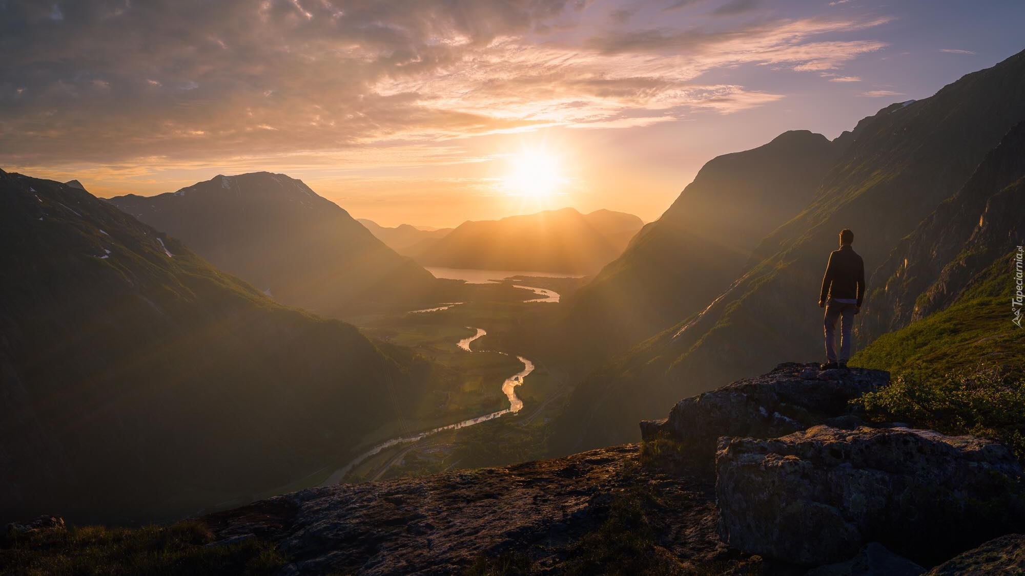 Edytor tapety: Człowiek stojący na tle gór o wschodzie słońca