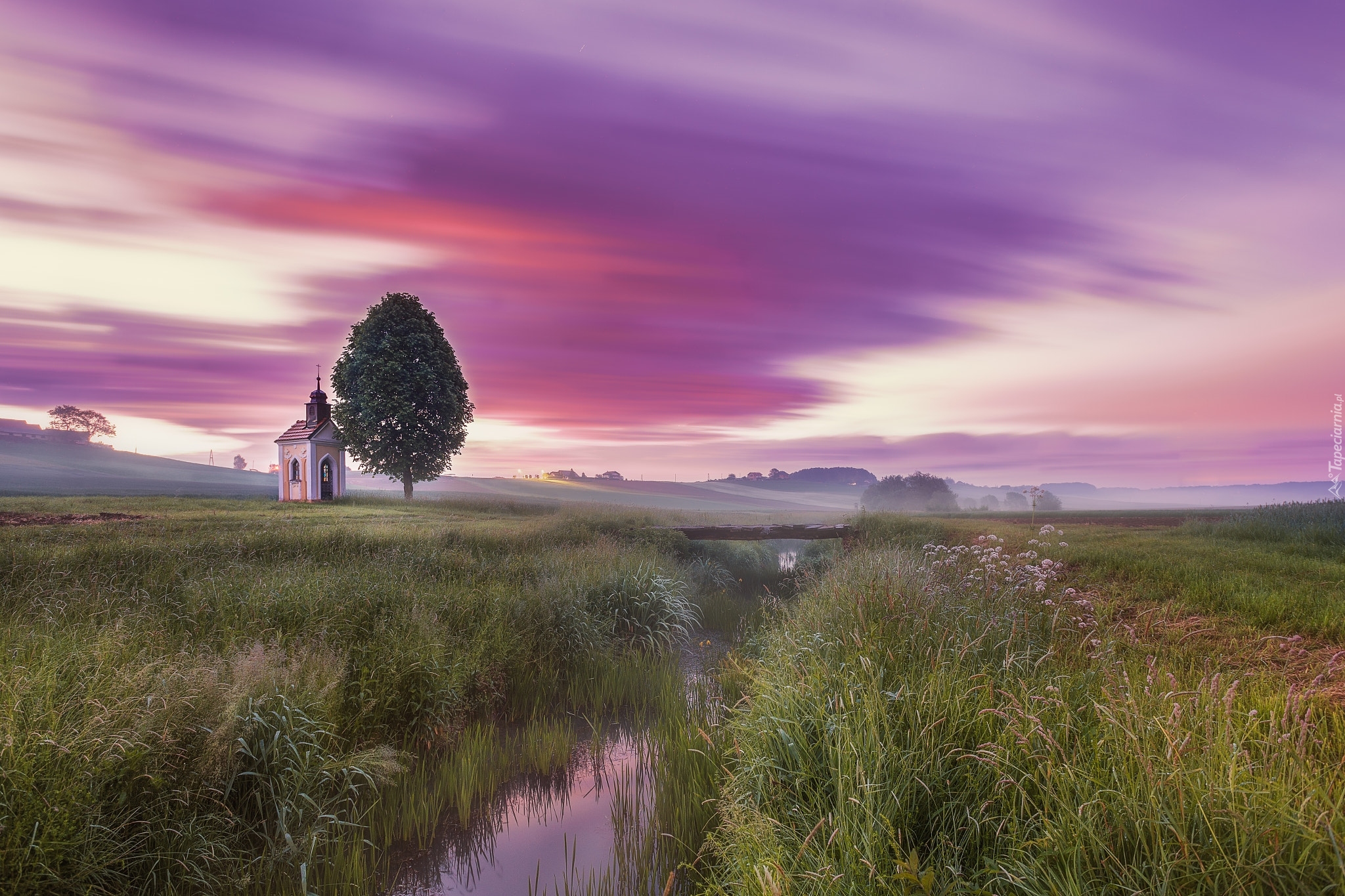 Edytor tapety: Kapliczka i drzewo obok rzeczki na łące