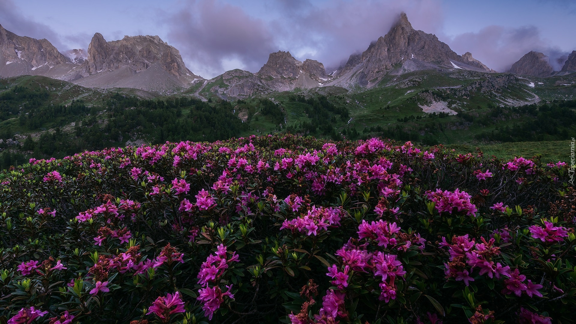 Edytor tapety: Różaneczniki i góry w tle