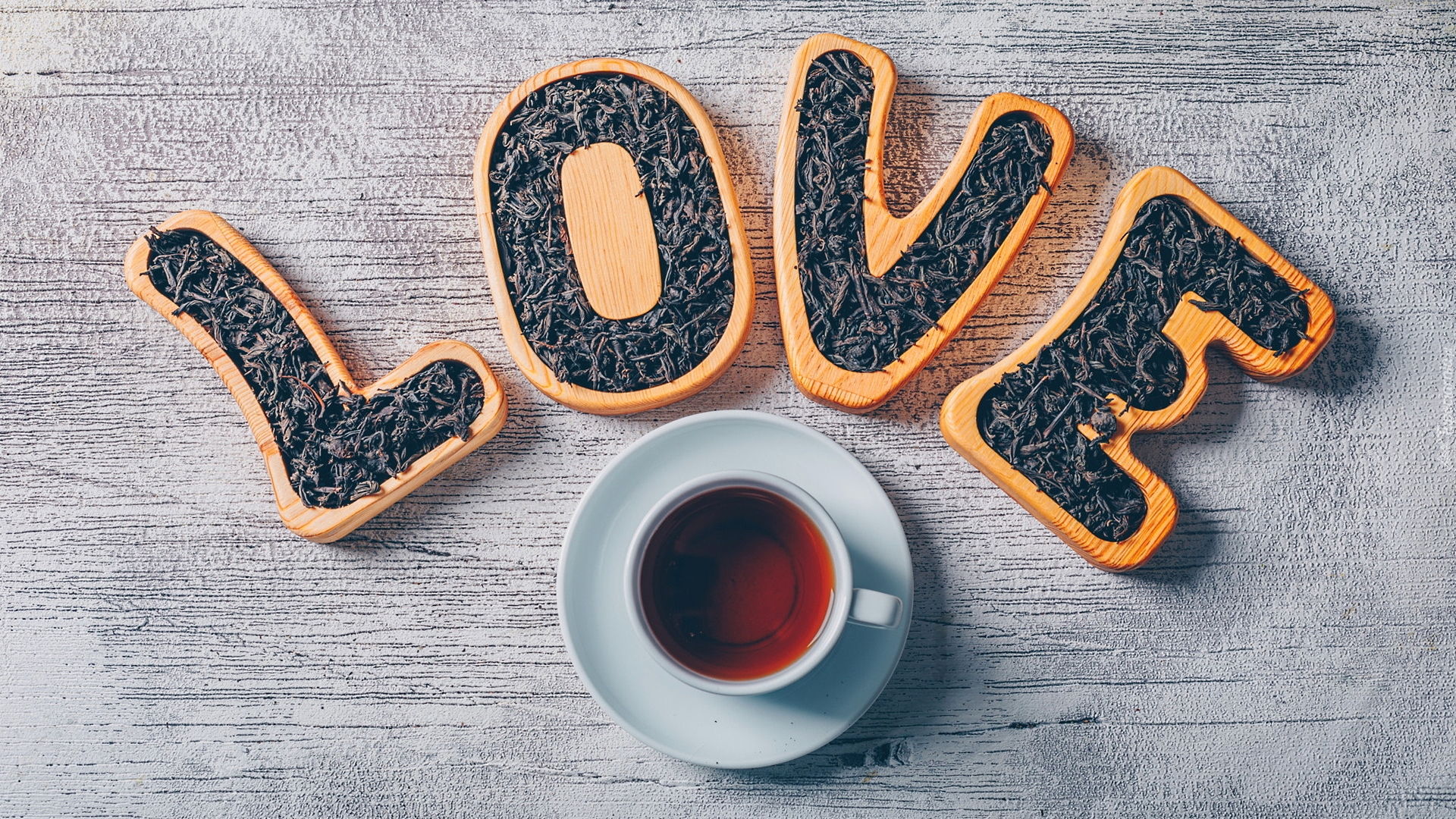Edytor tapety: Napis love nad filiżanką herbaty