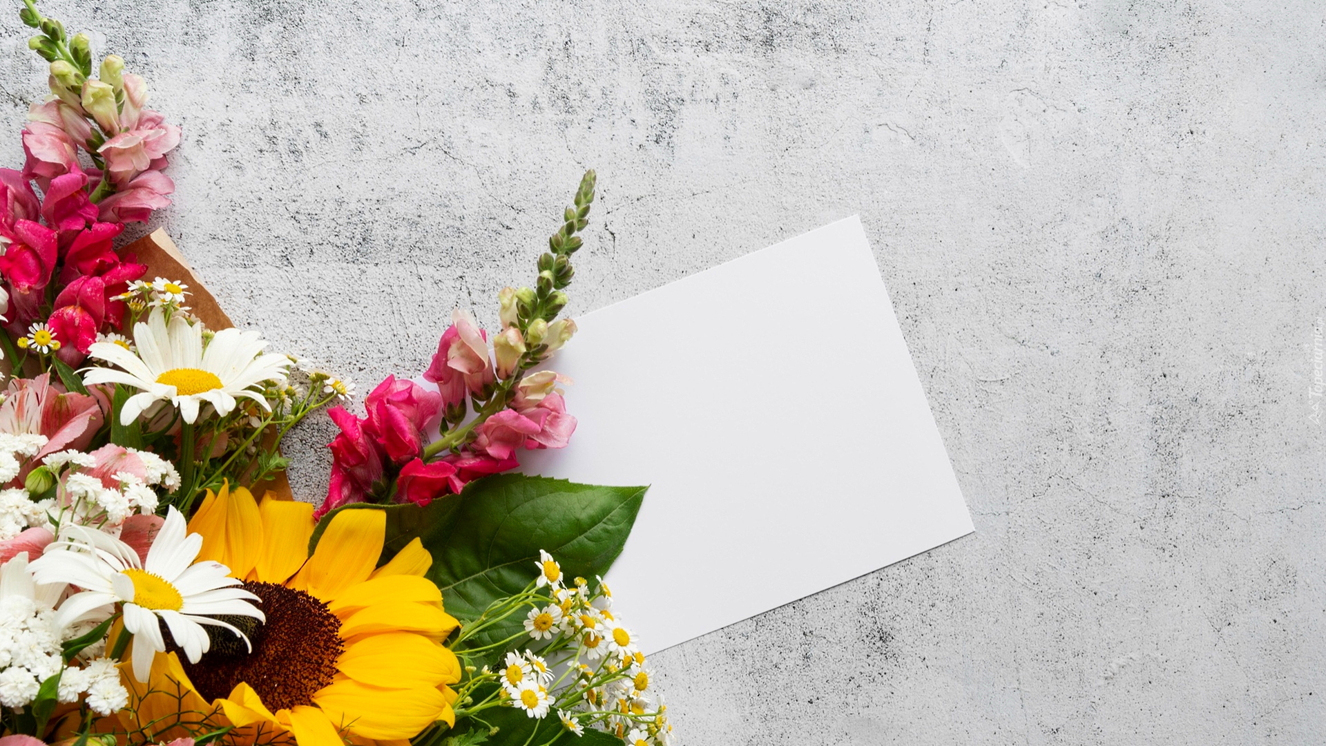 Edytor tapety: Bukiet kwiatów z białą kartką na szarym tle