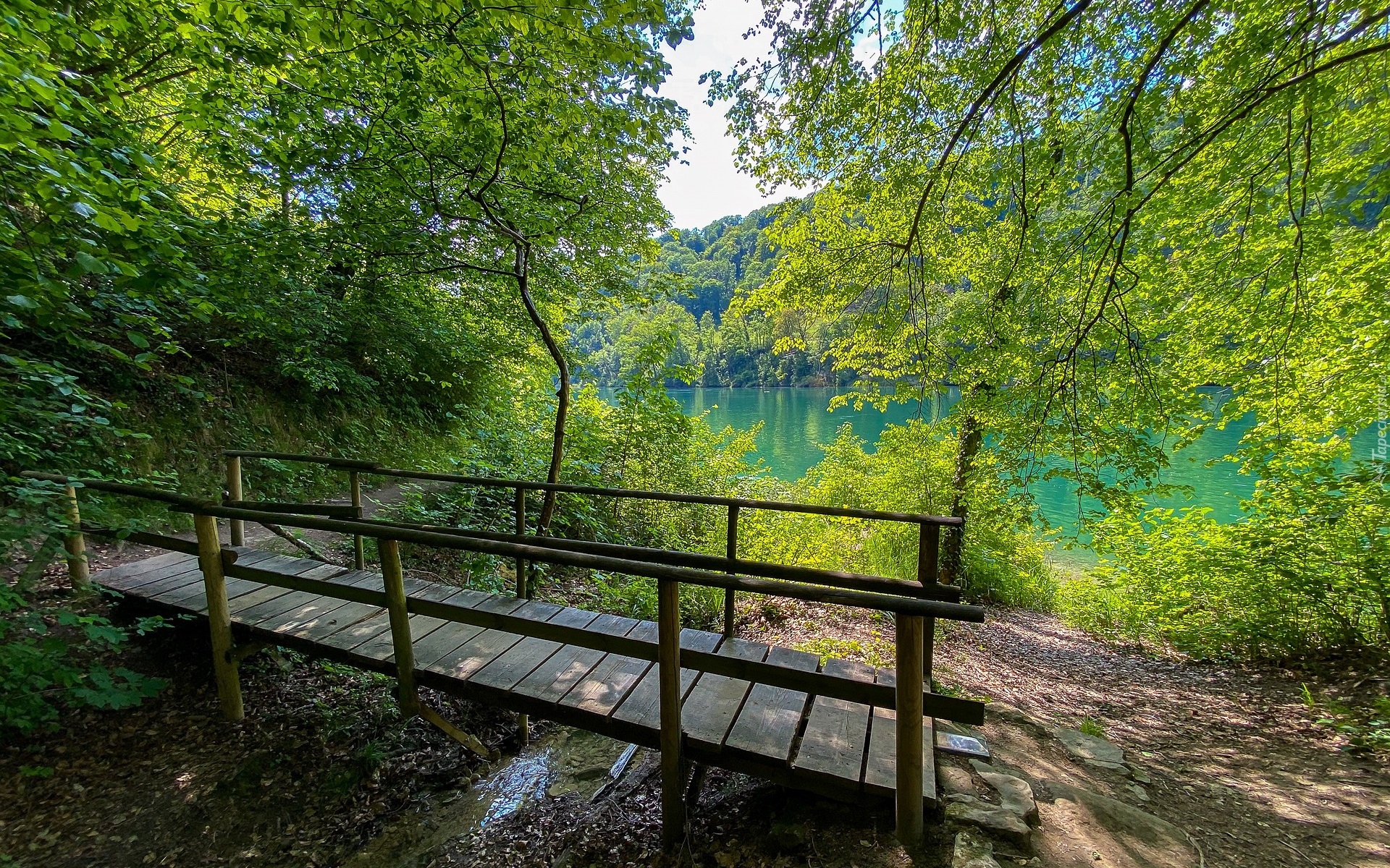 Edytor tapety: Drewniany mostek nad strumykiem wpadającym do jeziora
