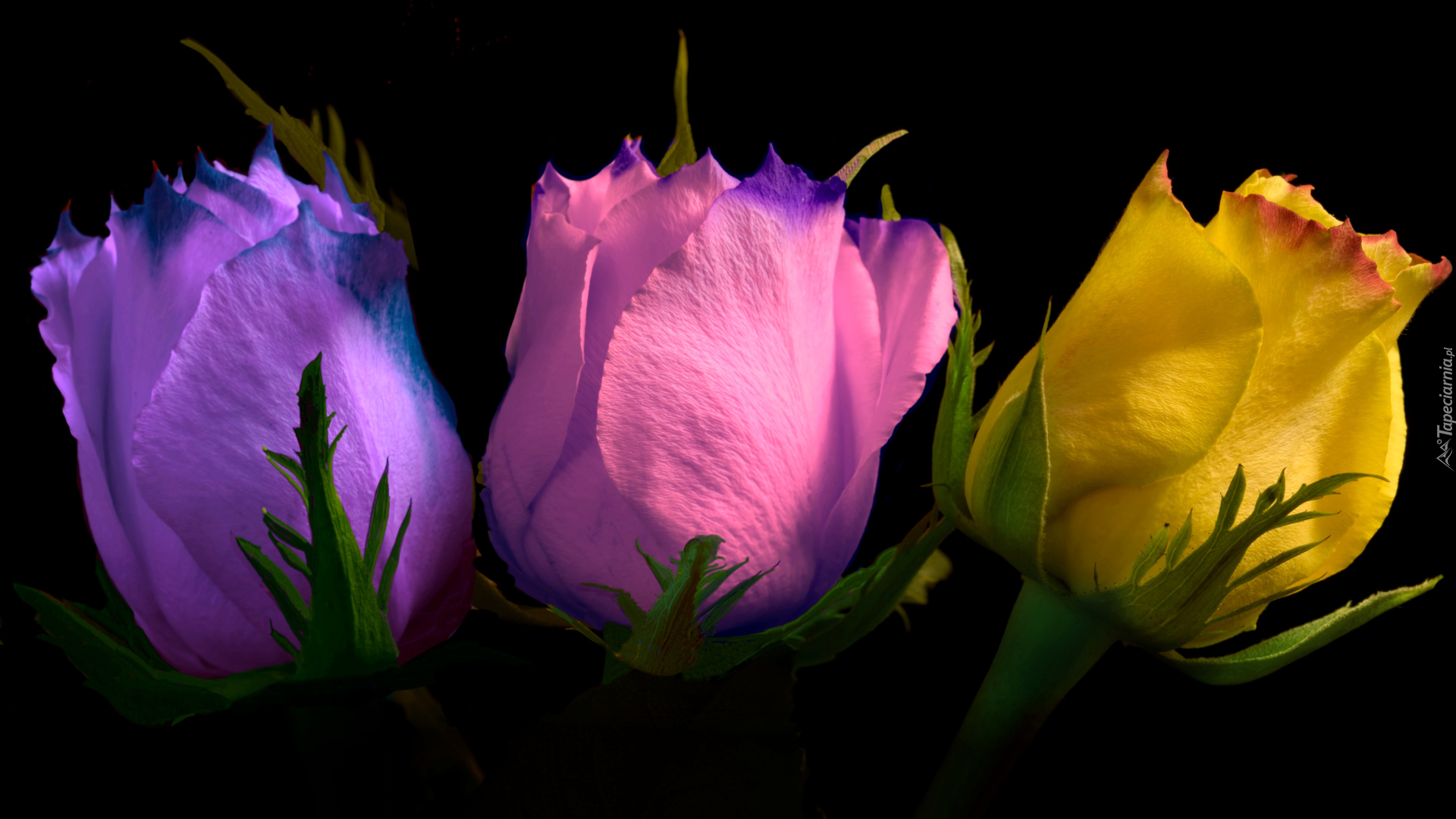 Edytor tapety: Trzy kolorowe róże na czarnym tle