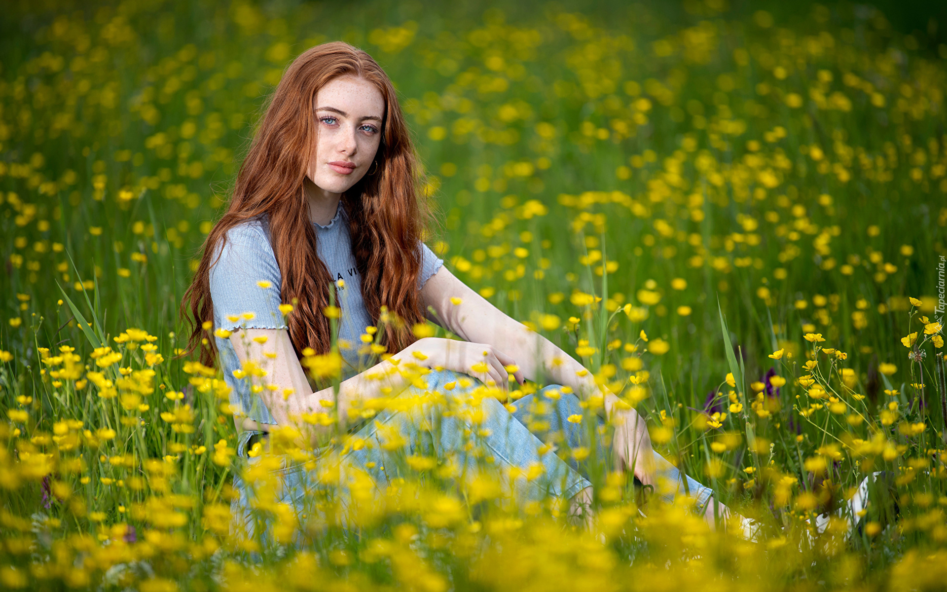 Edytor tapety: Rudowłosa kobieta na łące żółtych kwiatów