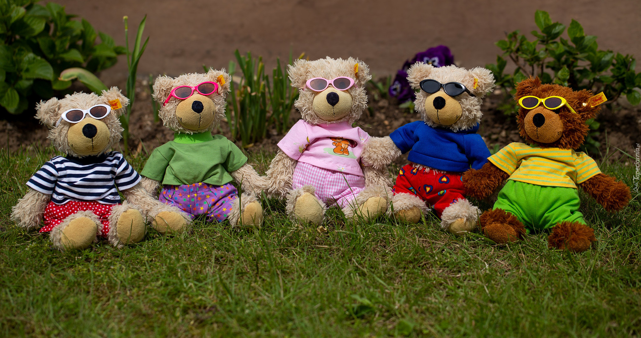 Edytor tapety: Pluszowe misie w okularach na trawie