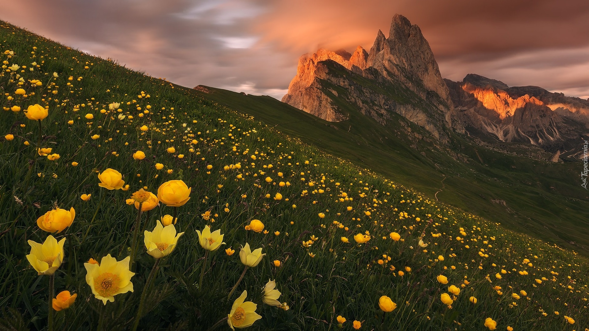 Edytor tapety: Żółte kwiaty na łące i widok na góry