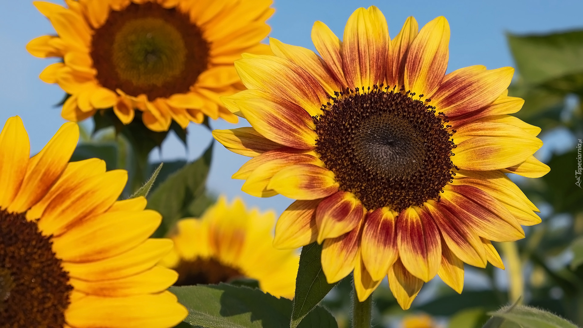 Edytor tapety: Słoneczniki na tle nieba w zbliżeniu