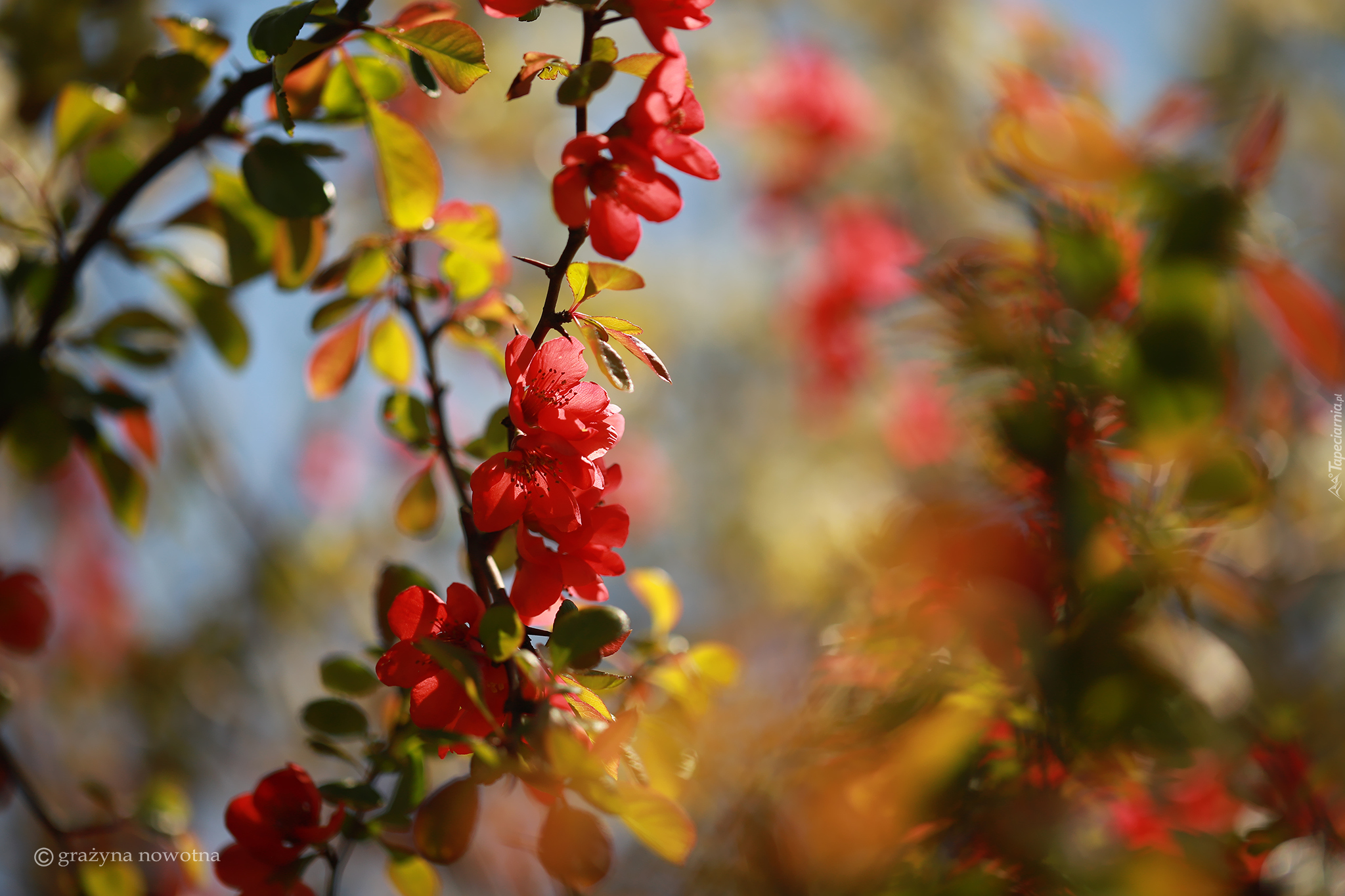 Edytor tapety: Rozświetlona gałązka kwitnącego pigwowca