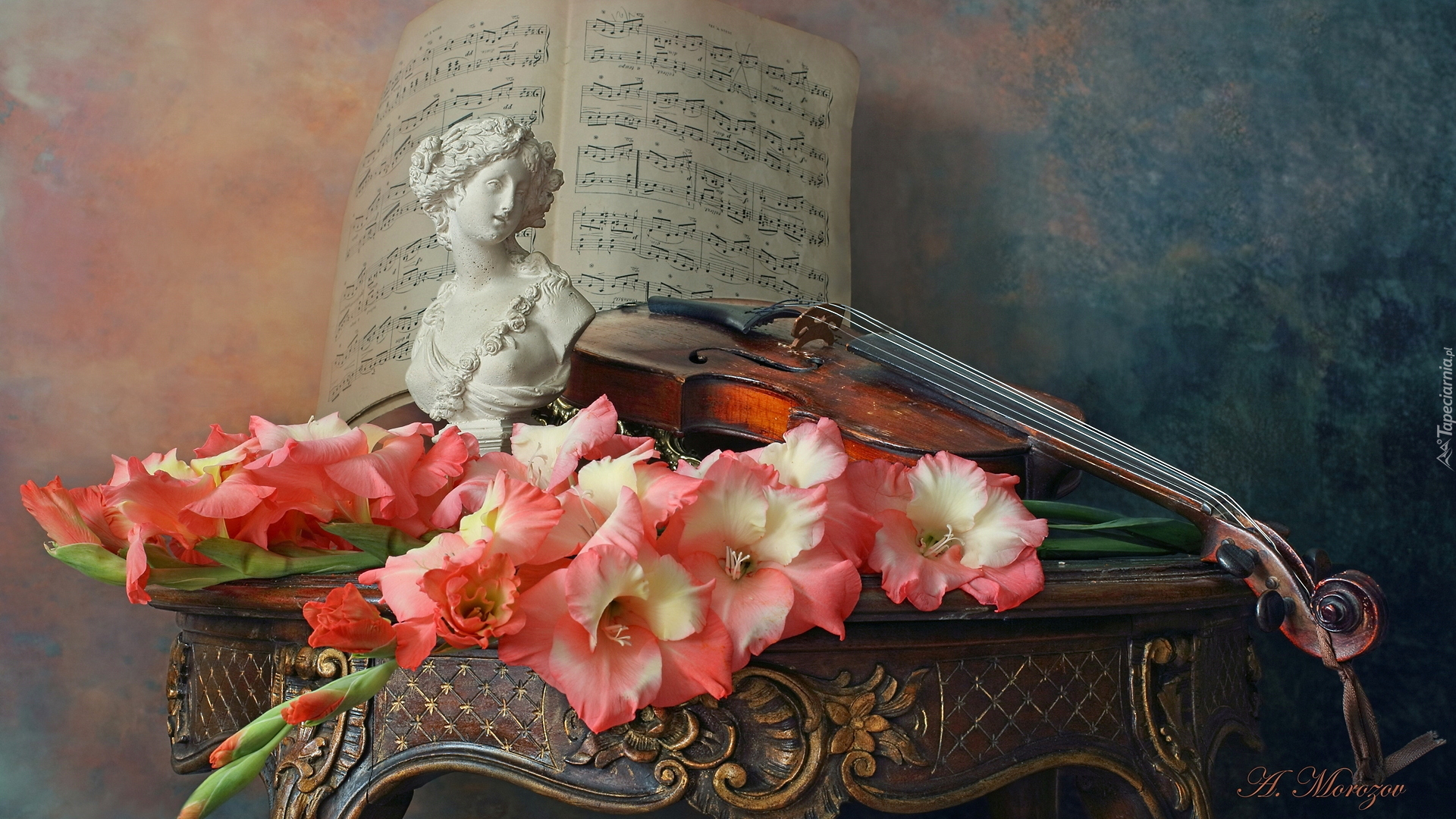 Edytor tapety: Popiersie kobiety obok nut skrzypiec i mieczyków