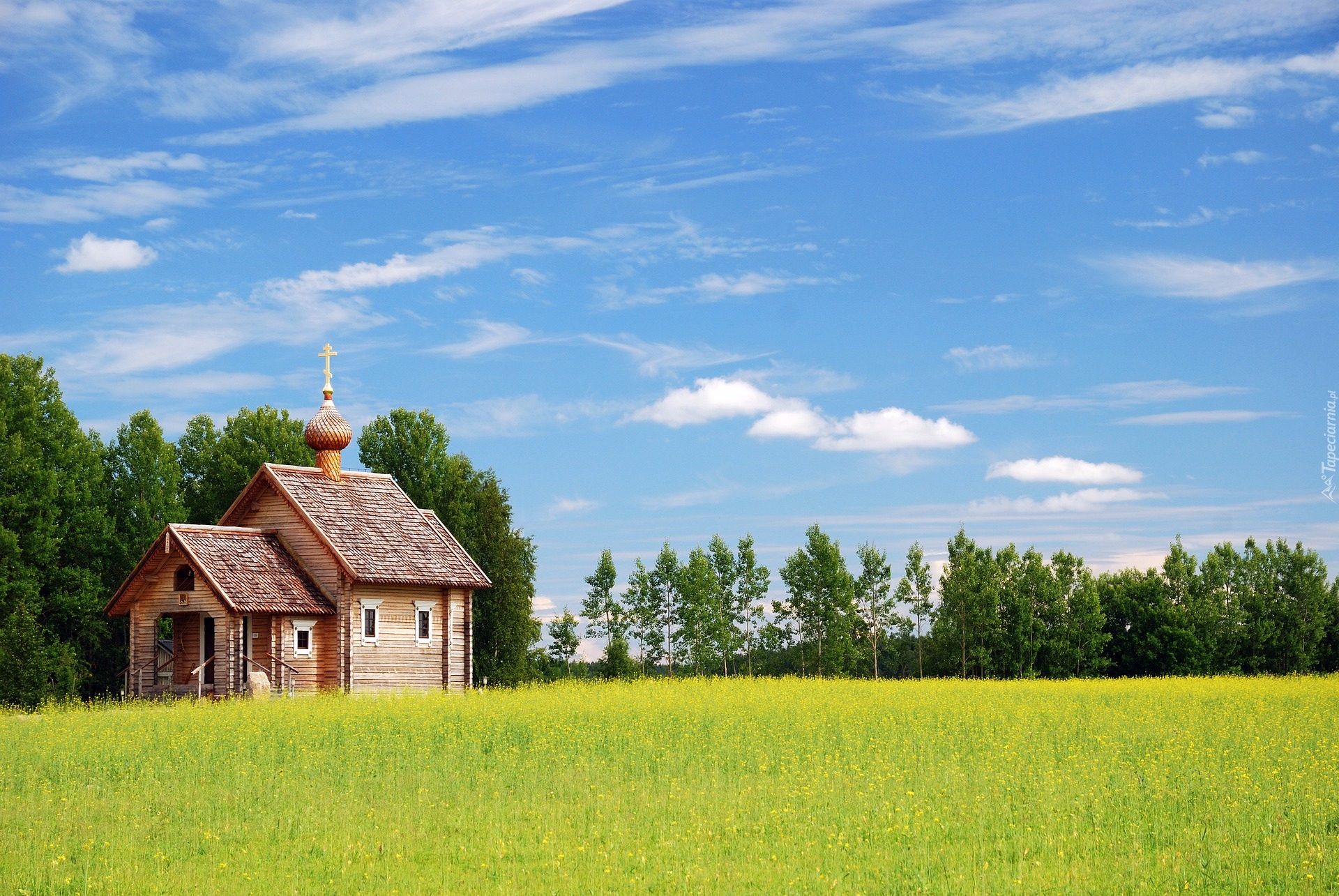 Edytor tapety: Drewniany kościółek na łące pod lasem