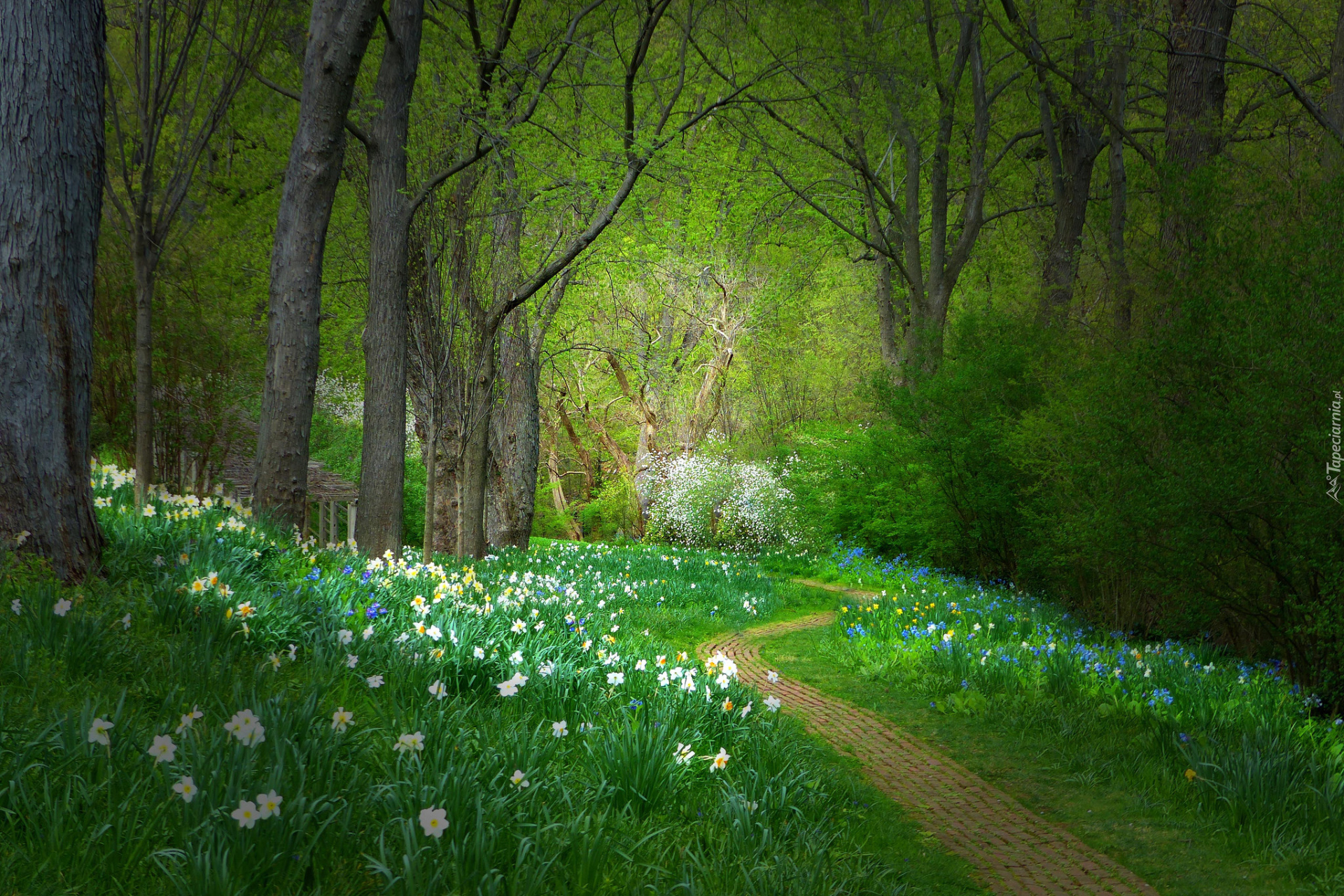 Edytor tapety: Kwiaty i zielone drzewa w wiosennym parku
