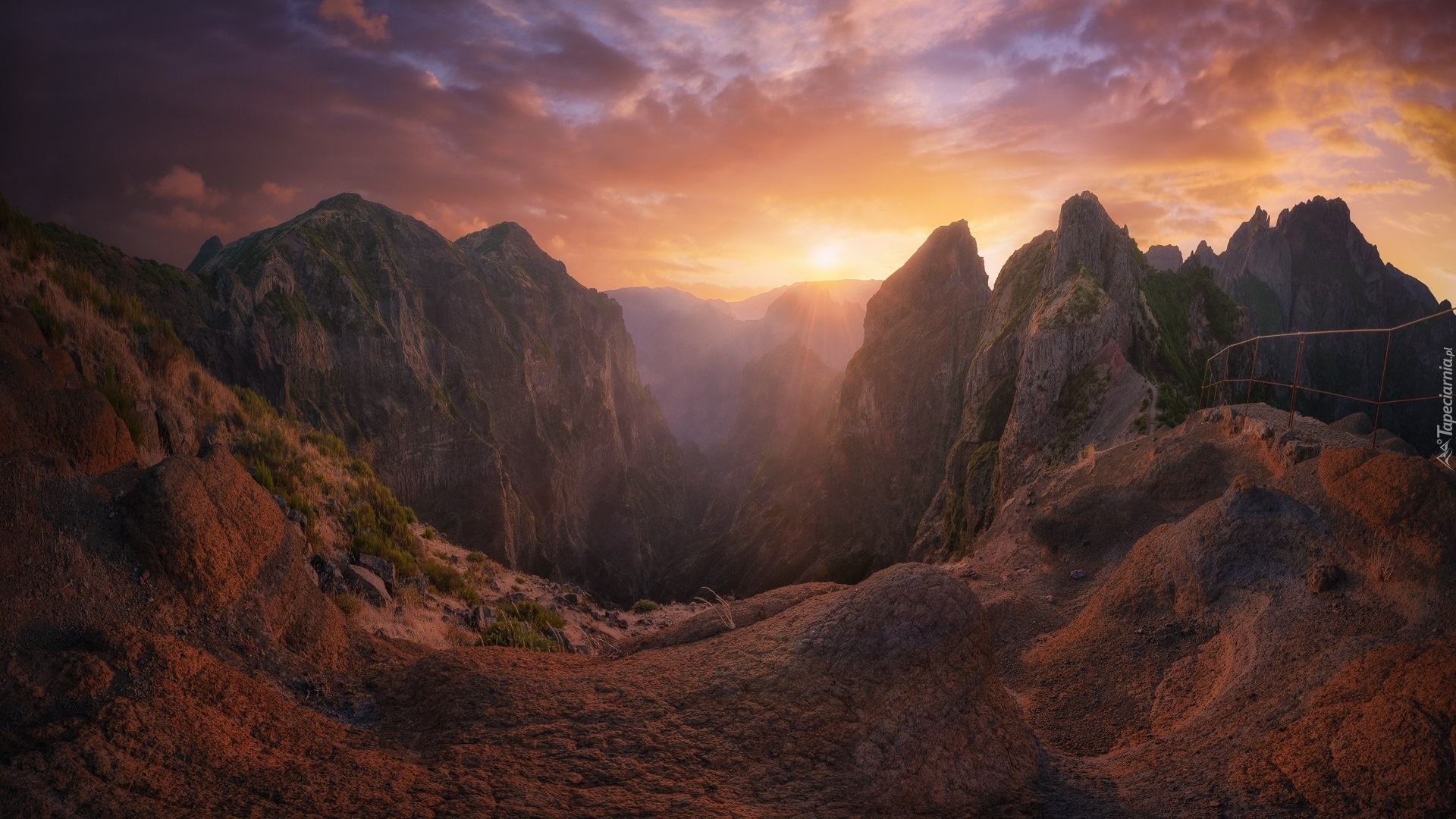 Edytor tapety: Promienie zachodzącego słońca nad skalistymi górami