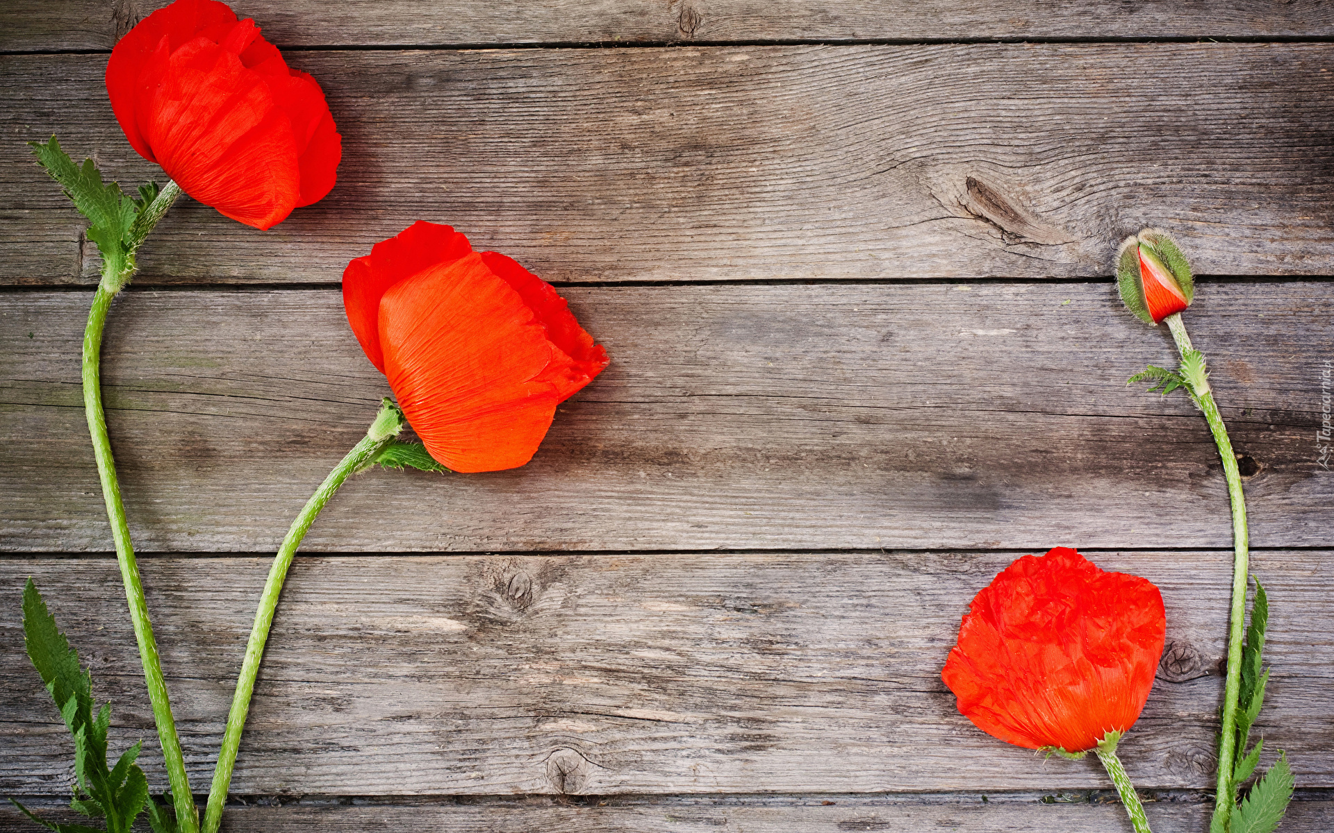 Edytor tapety: Trzy rozwinięte maki i pąk na deskach