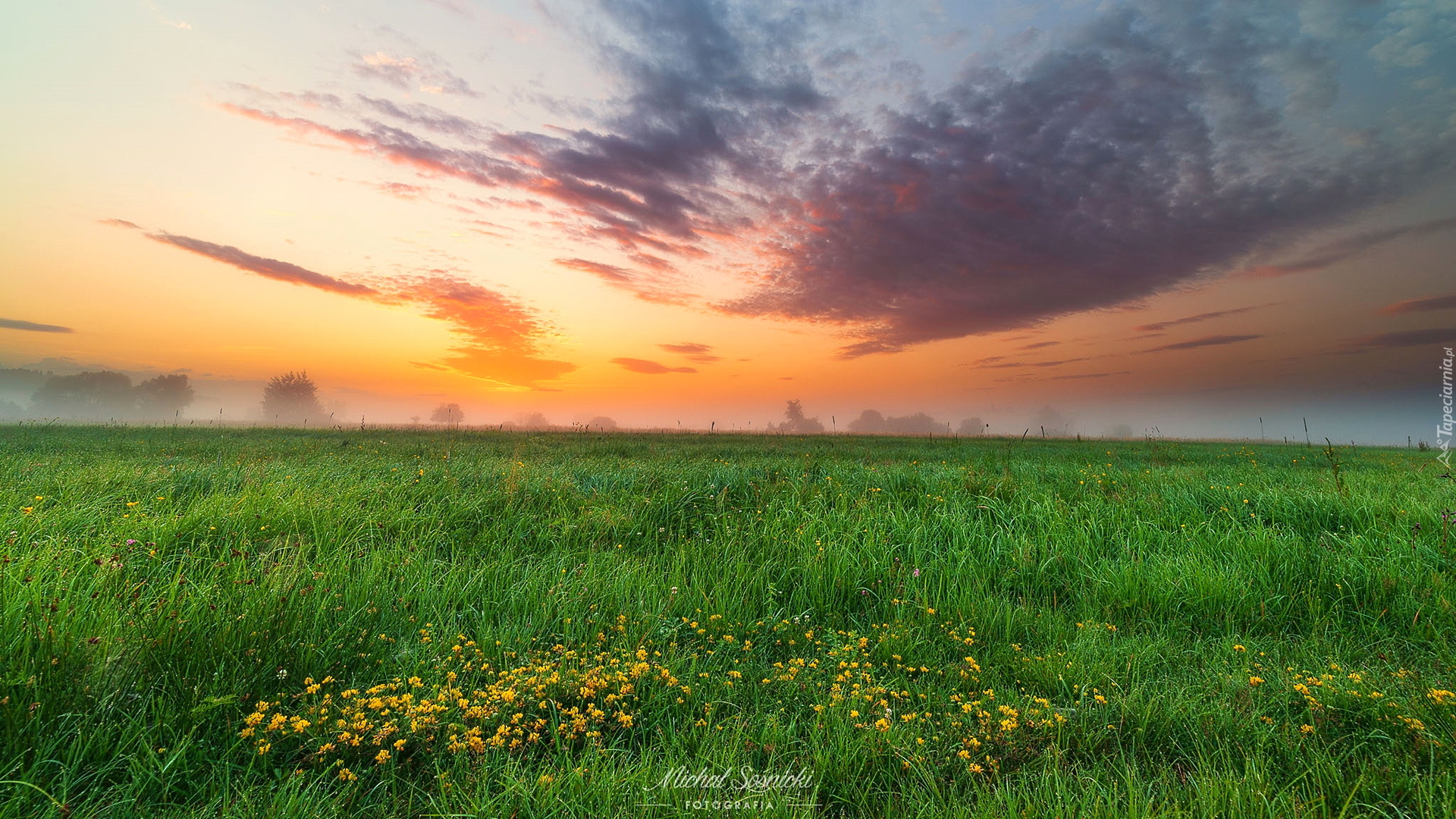 Edytor tapety: Zamglony wschód słońca nad łąką