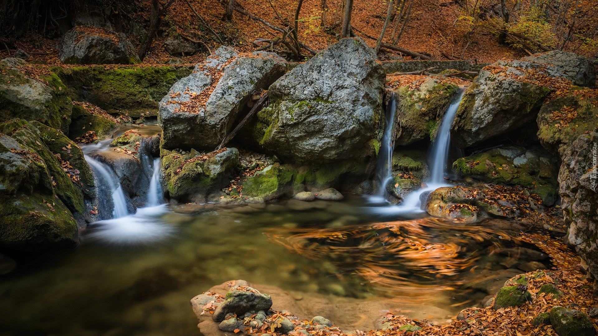 Edytor tapety: Woda spływająca szczelinami w skale do rzeki
